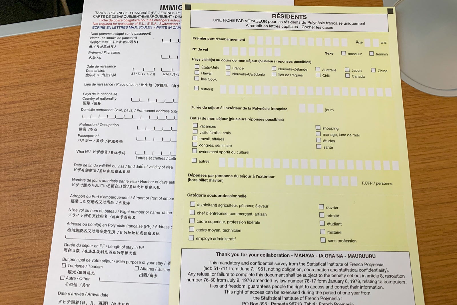 After boarding, I was surprised there were no announcements about travel requirements or entry restrictions. Flight attendants did hand out visitor and immigration cards not long after we crossed 10,000 feet about 20 minutes into the flight, but those forms were to identify the nature of your business in French Polynesia and your immigration status. The forms didn't even mention COVID-19.