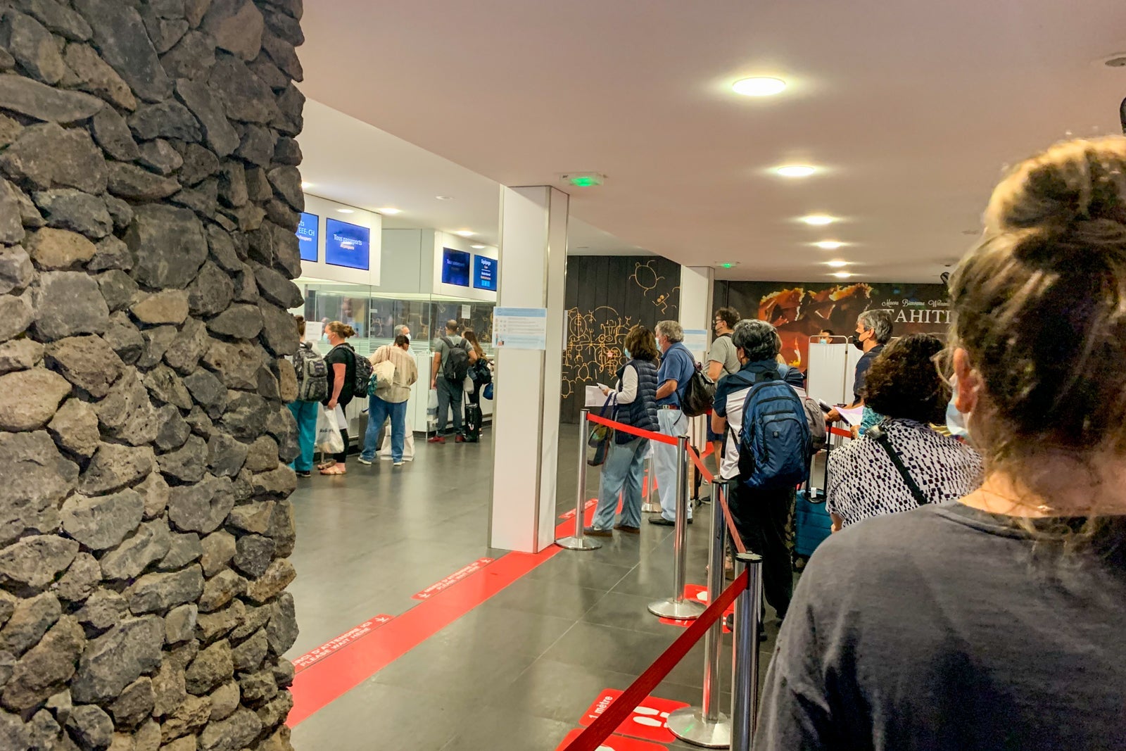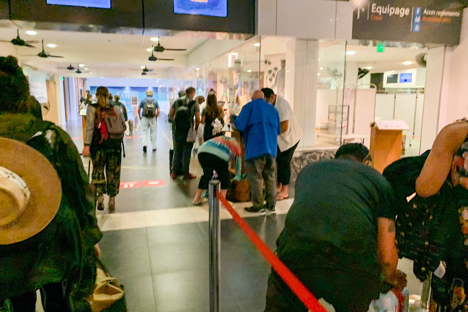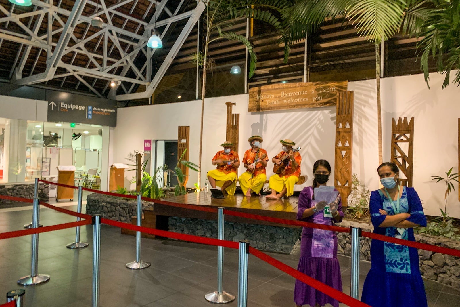 As soon as you enter the arrivals hall, you are greeted by an airport employee who directs you to one of two lines. To add to the ambiance, there is a three-person Polynesia band playing in the arrivals hall.