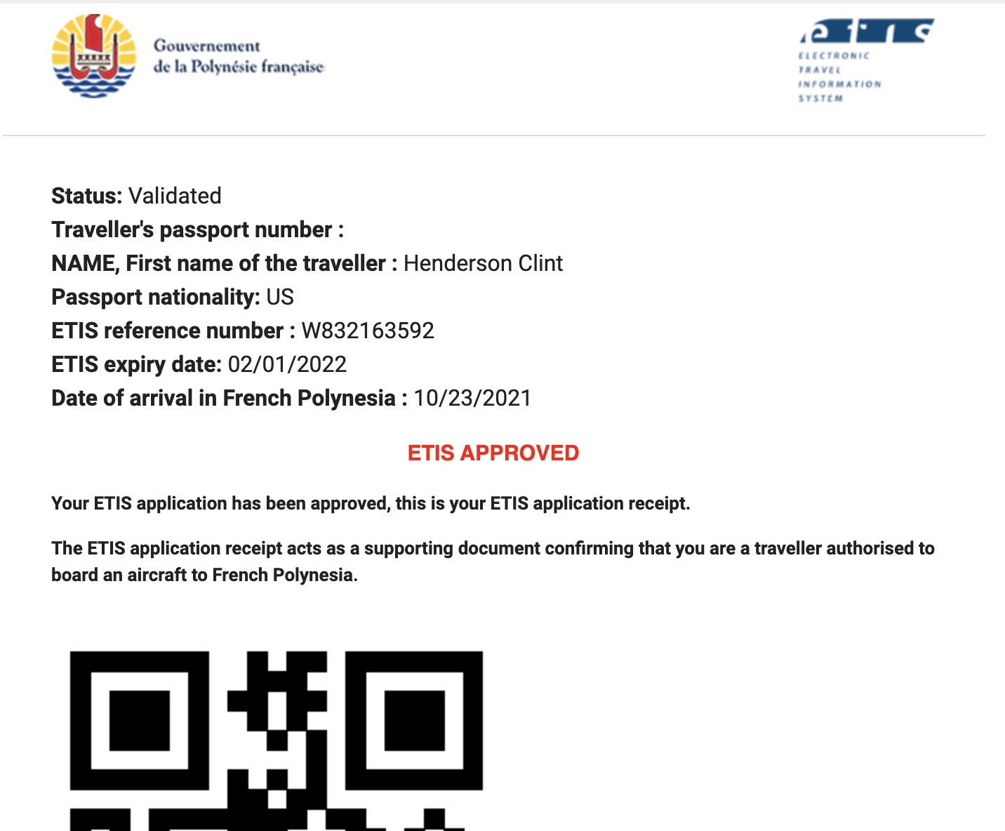 As this was my first international trip since the coronavirus pandemic, I was anxious and I made sure that I filled out the application for entry very early. I initially applied back in August. That trip got postponed, but I was able to use the same ETIS and just change the dates and the itinerary. Once I submitted the information, I had my visa with its special QR code within a day via email.