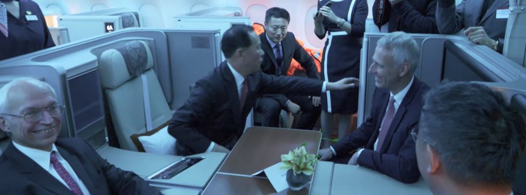 Images show what appear to be Thompson Vantage XL seats as found on South African, Qantas and RwandAir, replete with sliding doors as seen on Delta One Suites. The bulkhead row is quite unique, as the "Air Living Room" has a couple of tray tables that pop out and enable four people to sit together for meeting purposes.