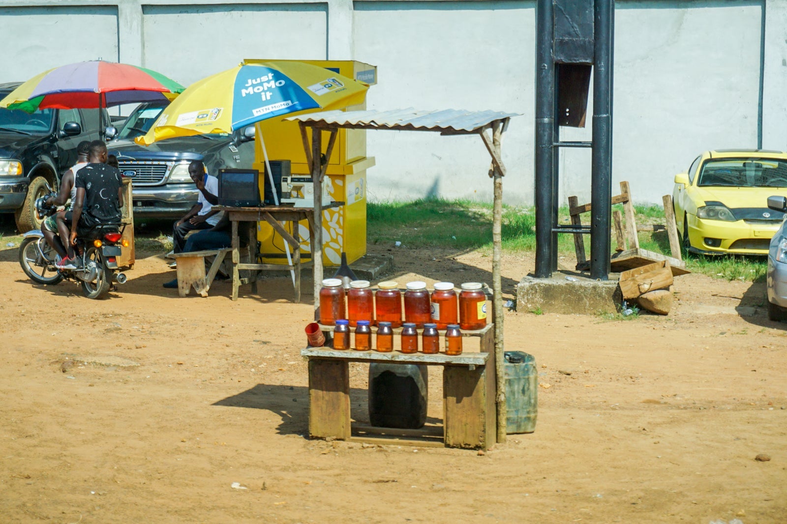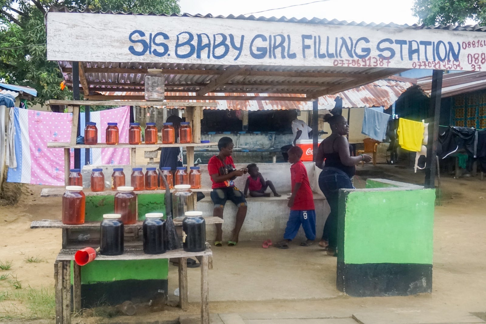 Later, we saw other larger stands with signs stating it was a "filling station." We asked our driver and found out that there aren't many working gas pumps. Plus, many Liberians can't afford to fill up a gas tank. So, entrepreneurial Liberians have set up informal filling stations along the main roads.