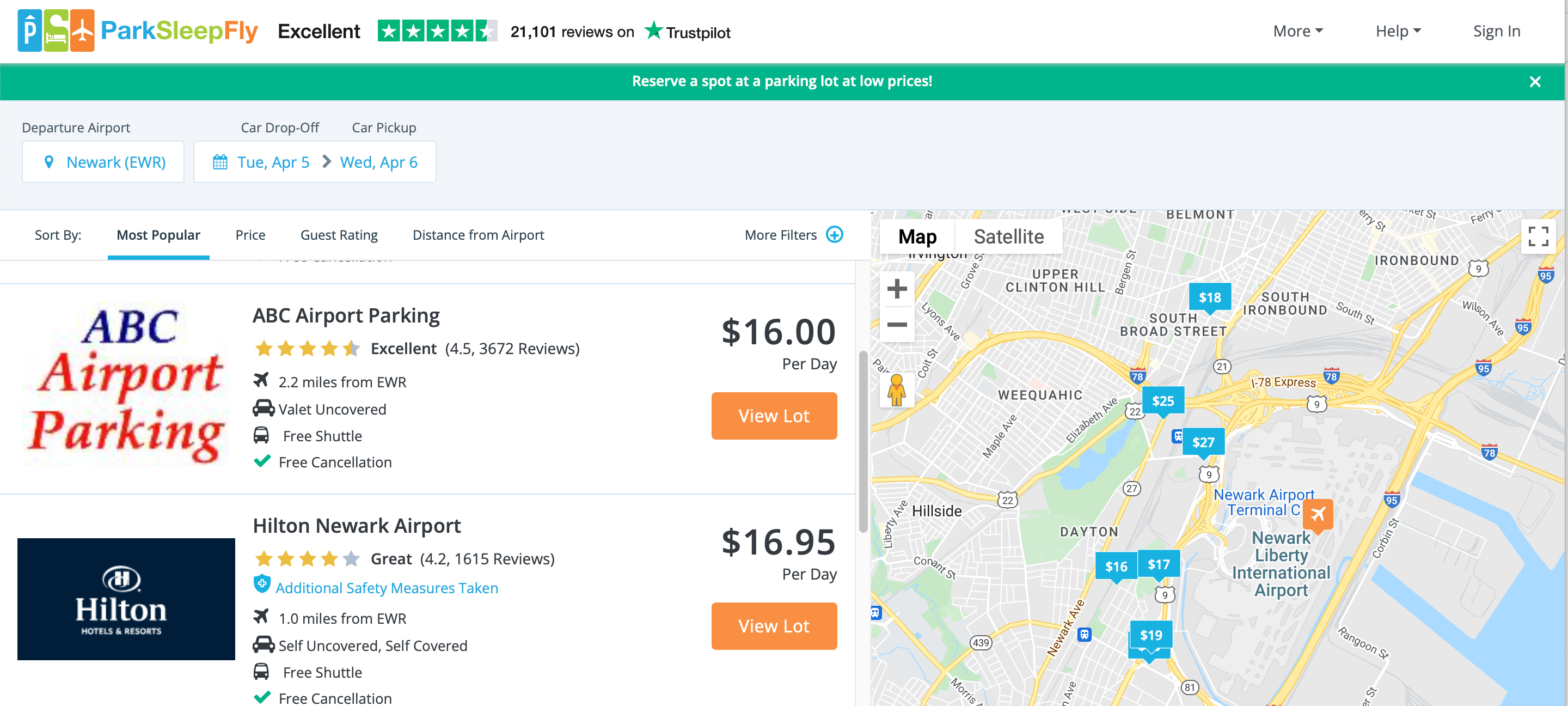 The official prices to park at Newark Liberty International Airport (EWR), for instance, are $10.50 to $44 per day (depending on the lot), but I found an offer through the ParkSleepFly website that would let you park at the Hilton Newark Airport for just $16.95 per day.
