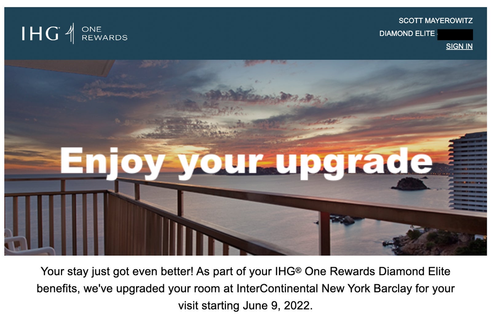 At 5:13 a.m., I had two identical emails in my inbox saying: "Your stay just got even better! As part of your IHG One Rewards Diamond Elite benefits, we've upgraded your room at InterContinental New York Barclay for your visit starting June 9, 2022."