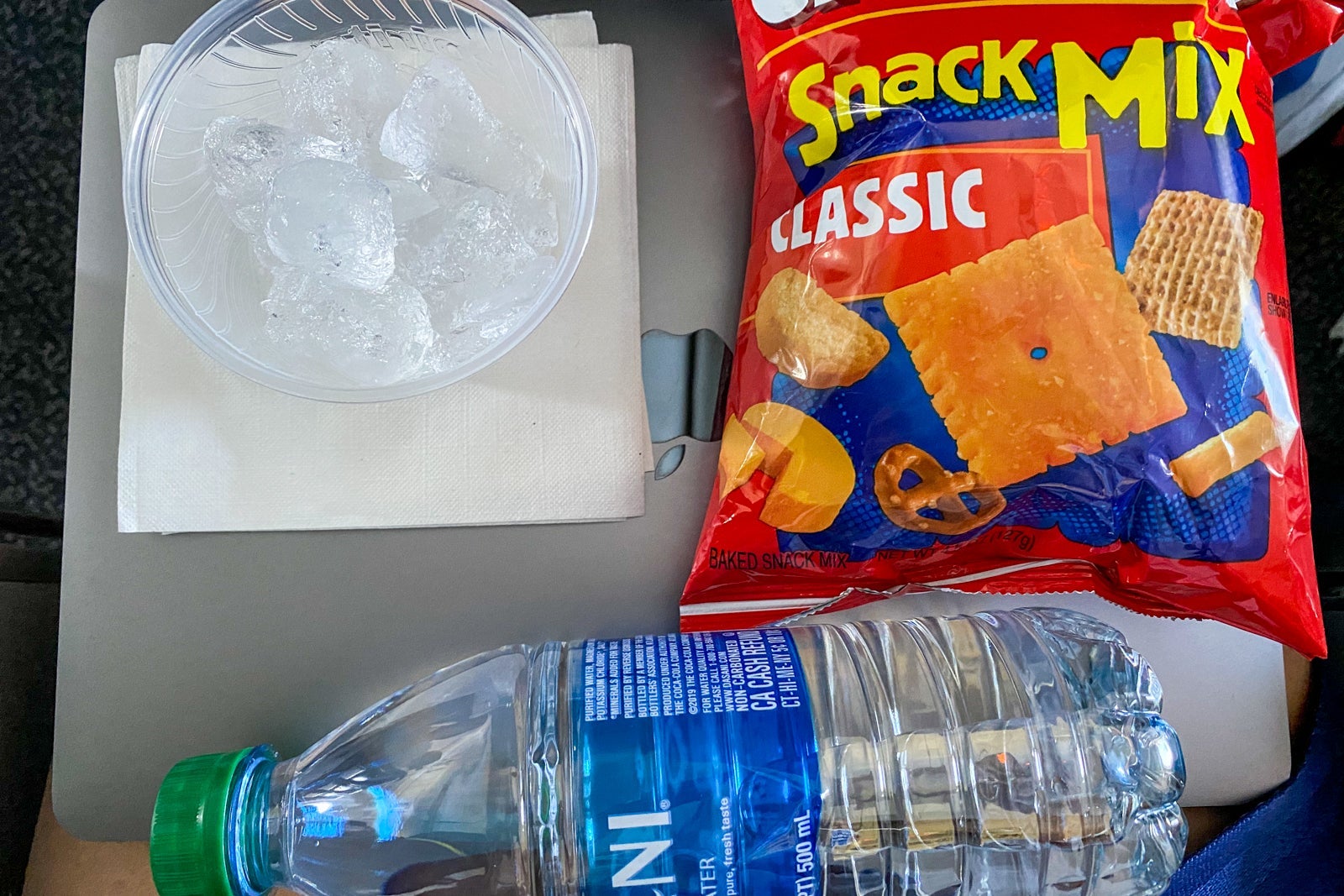 I pointed to where it said the word "Gold" on the black-and-white mobile pass, but that was met with skepticism. I was ultimately given my choice of a drink and snack worth up to $7. Not really knowing what was on the menu — since it isn't printed, and there's no onboard WiFi to look it up — I pointed to two things I could see in the cart: a bottle of water and a Cheez-It mix.