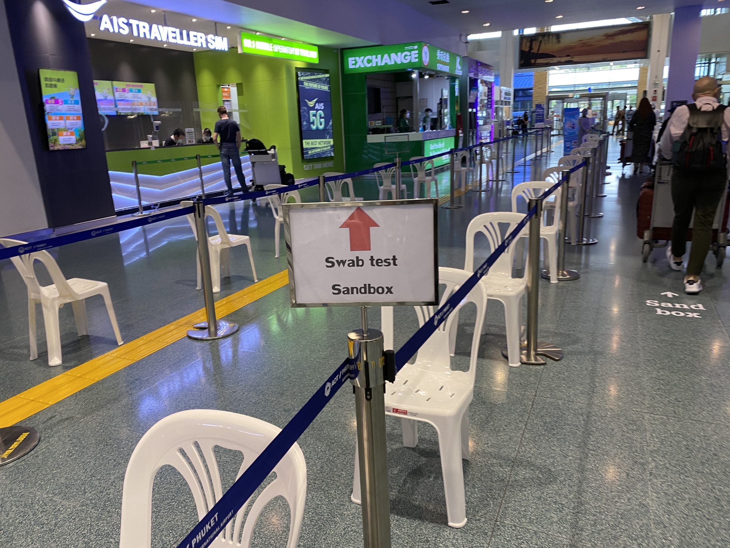 I had my passport checked for free pages and received a friendly "Welcome to Thailand" stamp. There were stands to purchase SIM cards (travelers need to have a working internet connection for contact tracing) and exchange money.