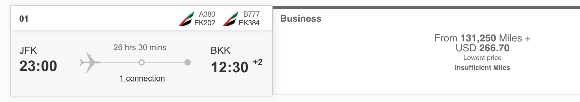 If you were flying from New York-JFK to Bangkok (BKK) in Emirates business, for instance, a one-way ticket would cost you 131,000 Skywards. Out of Los Angeles (LAX), that price would jump to 145,000 Skywards.