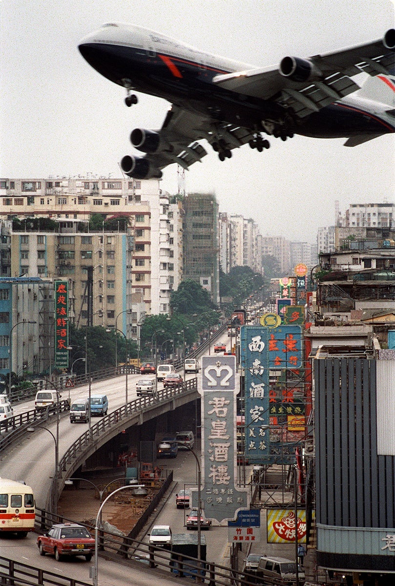 A famous place to see Jumbos doing breathtaking maneuvers was Hong Kong's old airport, Kai Tak, known by pilots and passengers for its very challenging approach over the city. The last turn to align with the runway was low over a densely packed neighborhood, often in tough weather. The 747, a docile and responsive flyer with plenty of power from its four engines, never let pilots down on the Kai Tak approach. Here's a British Airways -200 model on that last turn over Prince Edward Road in the 1990s.