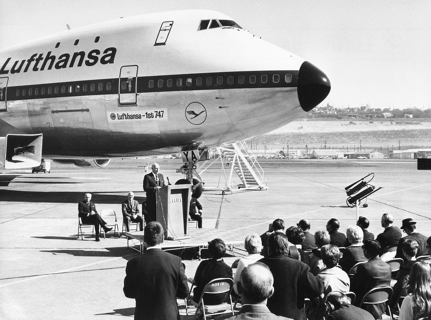 Early customers of the big bird were enthusiastic to take delivery of their first 747. In the 1970s, the Jumbo Jet was also a statement of prestige: you weren't a serious airline unless you flew the 747. When Lufthansa got the first of many Jumbos to follow, in 1970, dignitaries marked the delivery with speeches. It was, in a way, a worldwide announcement that the flag carrier of postwar Germany had joined the big leagues — where, in no small part thanks to the 747, it has been since.