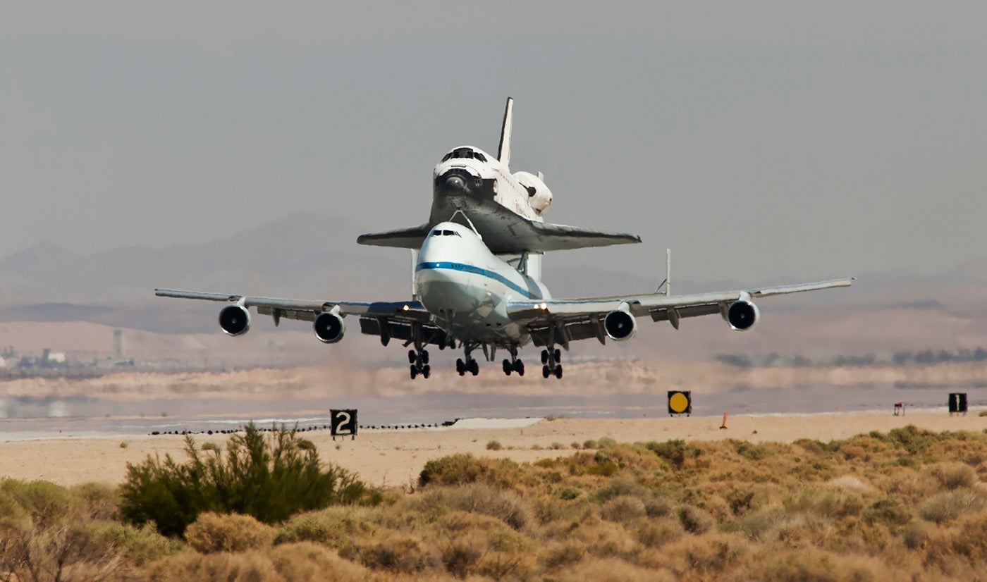 The 747 hasn't carried just passengers in its long career. Besides all-cargo versions, command post airplanes for the US Air Force and even a prototype interceptor that would have shot laser beams at incoming missiles, the Jumbo had a unique job beginning in the 1970s: It carried on its back the Space Shuttle. The Shuttle landed like a regular aircraft but could not take off unassisted, so it needed to get a ride on a real airplane to move between NASA facilities. Two 747s were converted for the job, which turned the combined Jumbo / Shuttle hybrid into one of the weirdest flying machines ever seen. Below is Endeavour, touching down at Edwards Air Force Base in California in 2012.