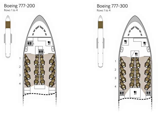 The 777-200 version has the galley and the toilet at the front, and the -300 version has lavatories at the back of the cabin. On both versions, that does mean there is through traffic, and Row 1 is closest to the galley. Given there's no other attraction to being in Row 1 (unlike the 747 and A380), I therefore avoid Row 1 and try to go for Row 2. Whether scientifically true or not, I think there's sometimes more through traffic on the A side, so 2K is usually my go-to seat on the 777.