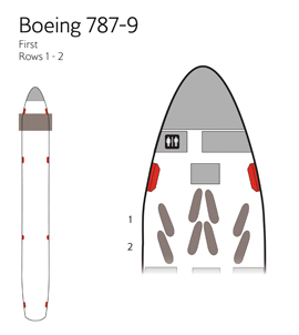 The first-class cabin on the bigger of BA's Dreamliners features the newest first-class seat and is also the smallest cabin with only eight seats spanning over two rows.