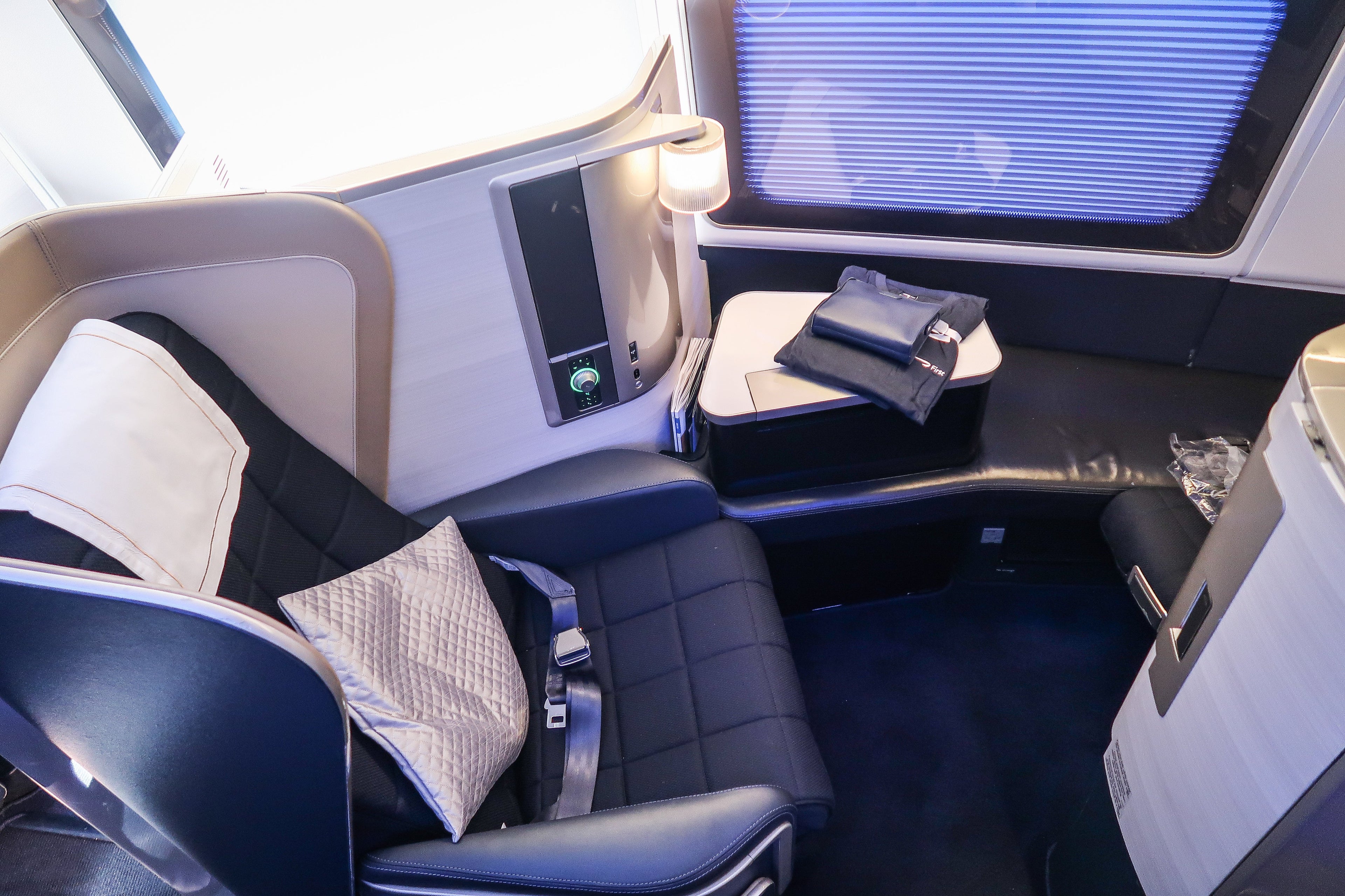 The middle seats are best suited for anyone travelling with a companion, especially as this first-class seat does not feature buddy dining. Given the smaller cabin, there are fewer choices for a good (or bad) seat. Some prefer Row 1 for 'prestige' reasons (who doesn't like 1A on their boarding pass), though general consensus is that Row 2 is quieter, as it's farther away from the galley. The Club World cabin is right behind Row 2, but there's limited crew through-traffic and there's a proper 'wall' divider together with a strong curtain. The picture below is me in 2A.