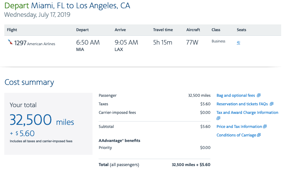 However, the airline will operate a 777-300ER with this type of seat on its route between Los Angeles (LAX) and Miami (MIA) starting in June. So instead of the 30,000–80,000 miles you'd need for a longer flight, you can consistently book this route for just 32,500 miles each way. Here are tips to maximize American Airlines awards.