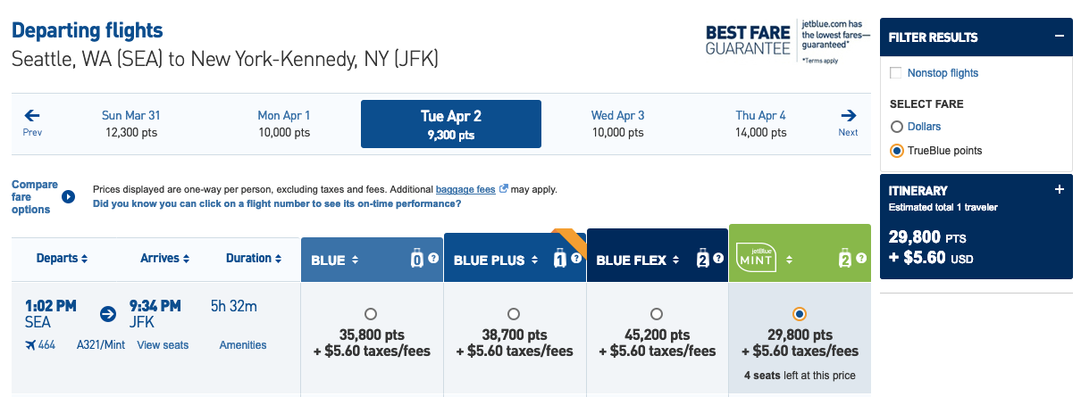 While points pricing can thus be high for airfares that range up to more than $1,200, there are some routes with regular deals, like from Seattle (SEA) to New York (JFK). Here's an example where you'd only need 29,800 points plus $5.60 to fly this route in Mint.