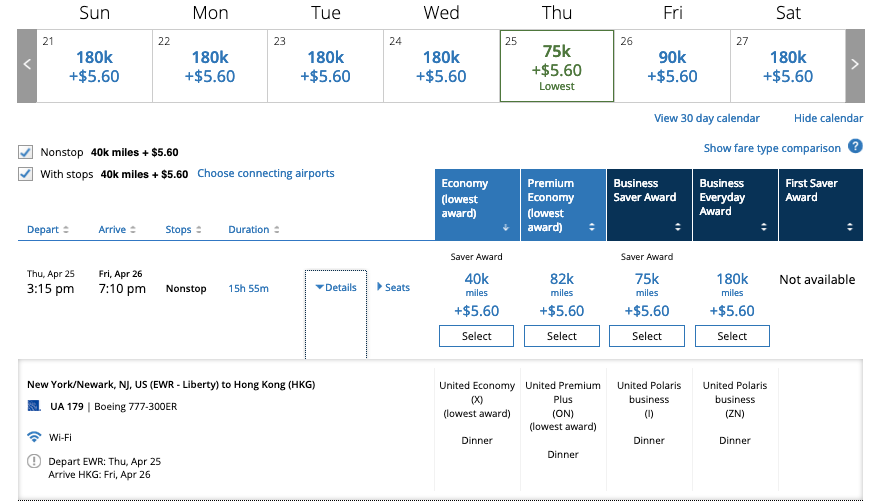 Here's an example award at the saver level on a 777-300ER from Newark (EWR) to Hong Kong (HKG) in April for 75,000 miles and $5.60.