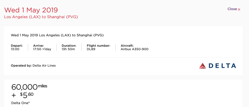 Unfortunately, Delta has made Delta One Suite awards exorbitantly expensive in most cases, with some mileage requirements ranging between 280,000–465,000 miles…each way! However, you can find decently priced awards ranging from 50,000–60,000 Virgin Atlantic Flying Club miles thanks to the two airlines' partnership. The routes to/from China seem to have the best availability, like this example from Los Angeles (LAX) to Shanghai (PVG). Virgin Atlantic is a transfer partner of Amex, Chase, Citi and Marriott, so it's relatively easy to stock up on Flying Club miles, even if you don't fly the airline.
