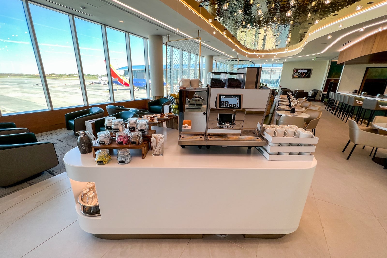 While all food and beverage is ordered through the app, you can prepare your own coffee at the espresso machine in the center of the lounge.