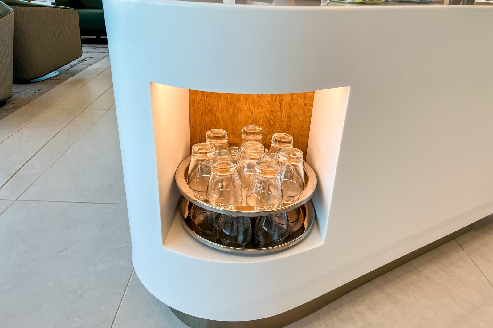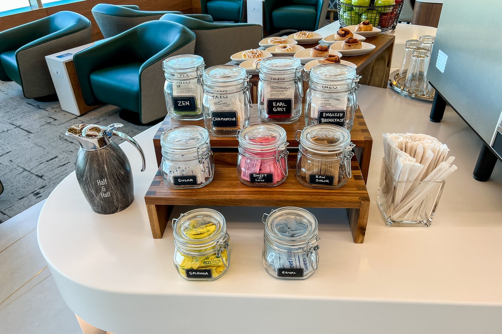 There's an espresso machine, tea and light snacks available at the island on the right-hand side of the lounge.