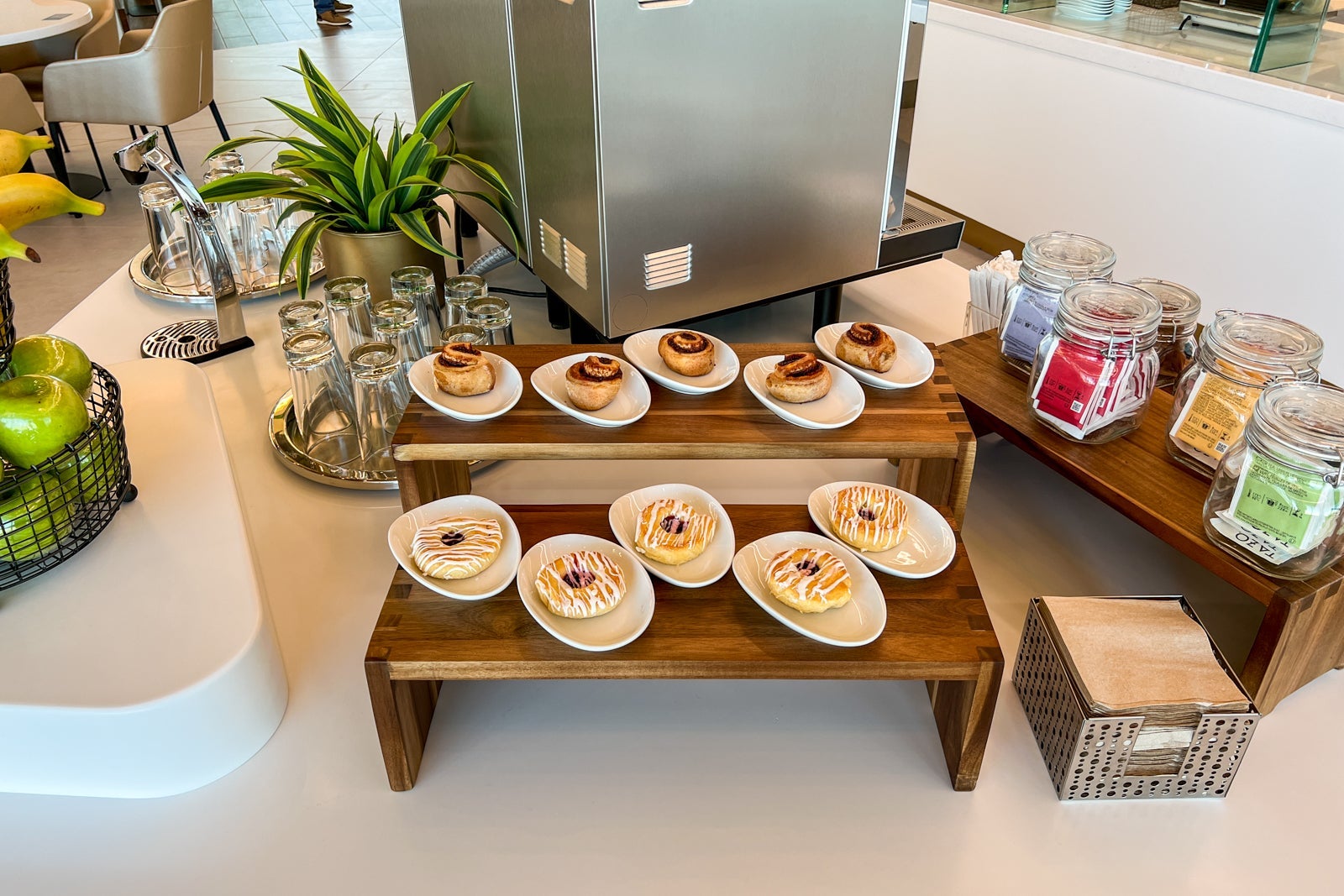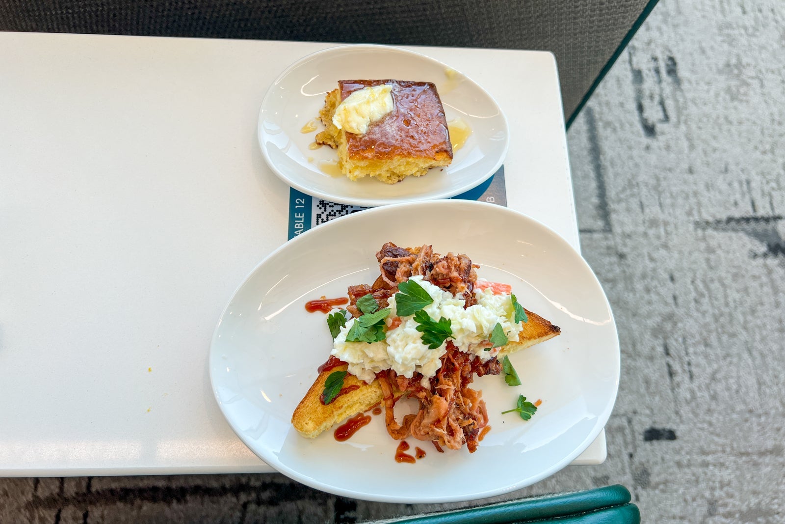 When I visited, I was treated to a small tasting menu. The breakfast menu is pretty basic, with things like yogurt parfaits, cinnamon rolls and eggs on offer. Everything I ordered was tasty, and the food was much more premium than what you'd find at a nearby Admirals Club.