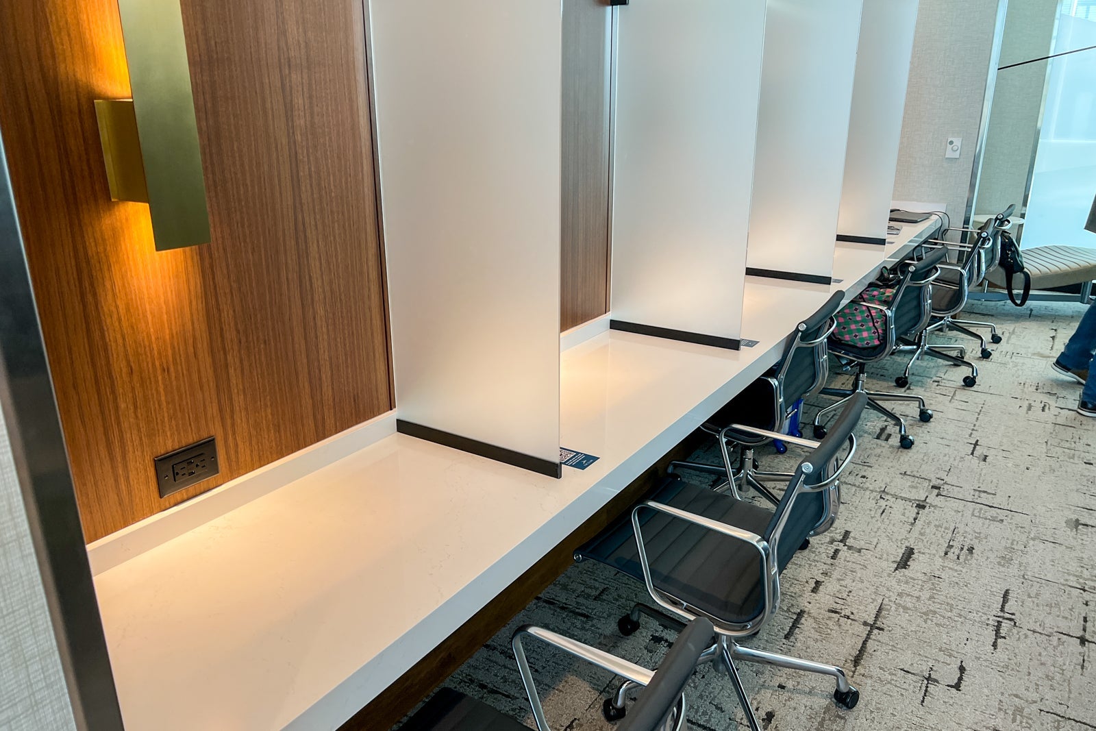 To the right of the bar is the lounge's productivity area, likely designed with business travelers in mind. You'll find a row of traditional desks lining the wall.