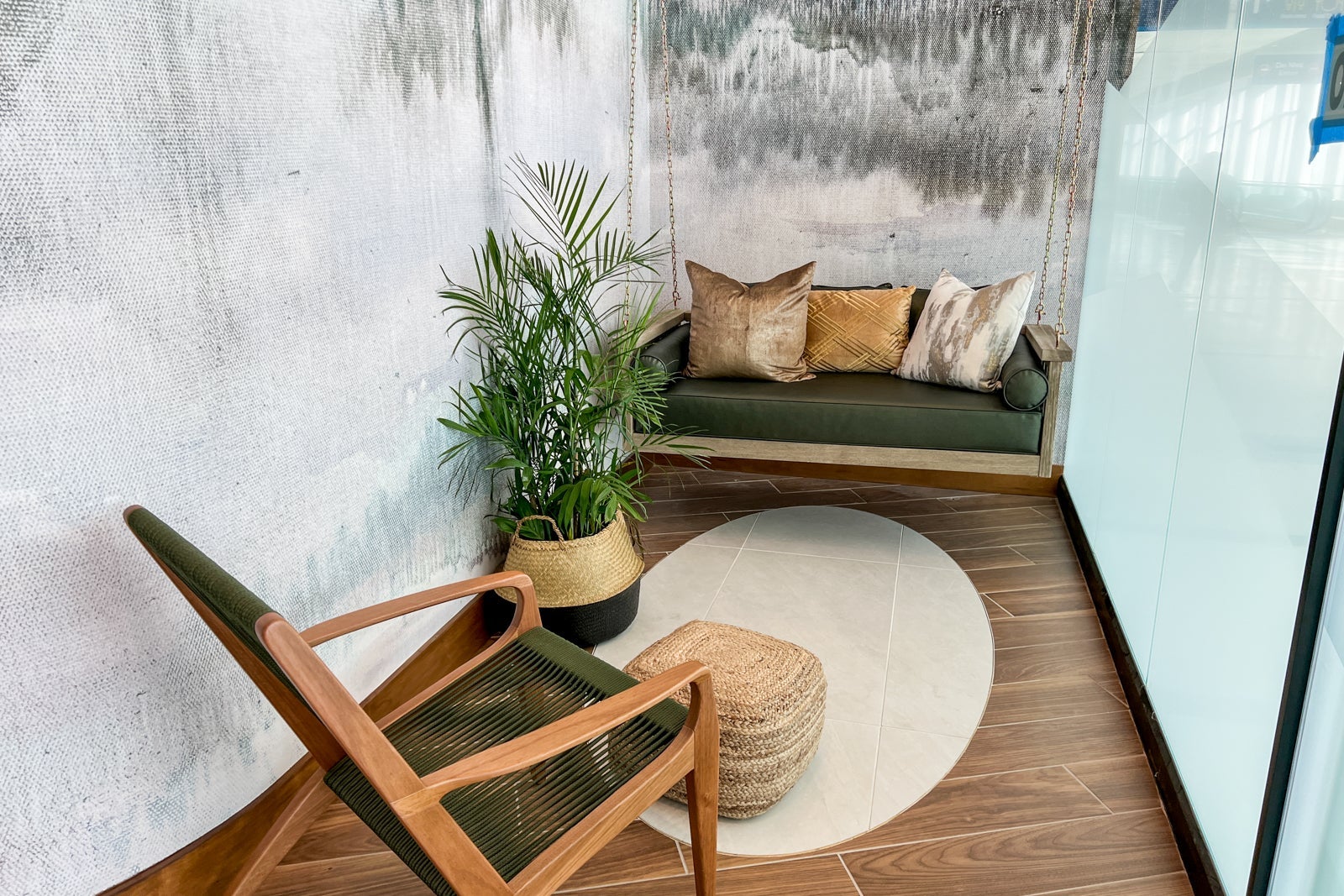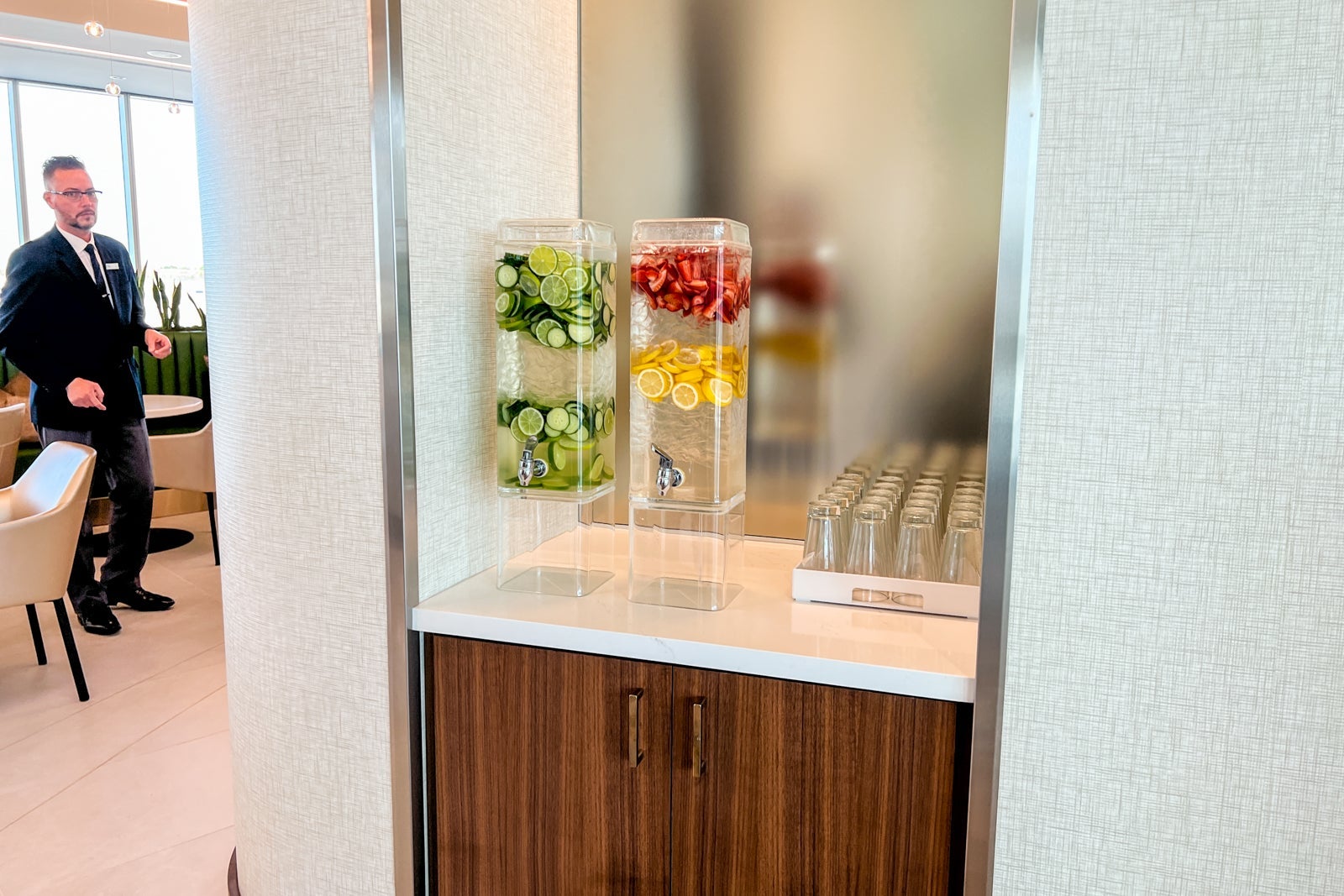 When you enter the lounge, you're greeted with a check-in desk. There's also a small seating area at the front of the lounge, complete with a porch swing. As you walk through the check-in area, you'll find filtered water to your right.