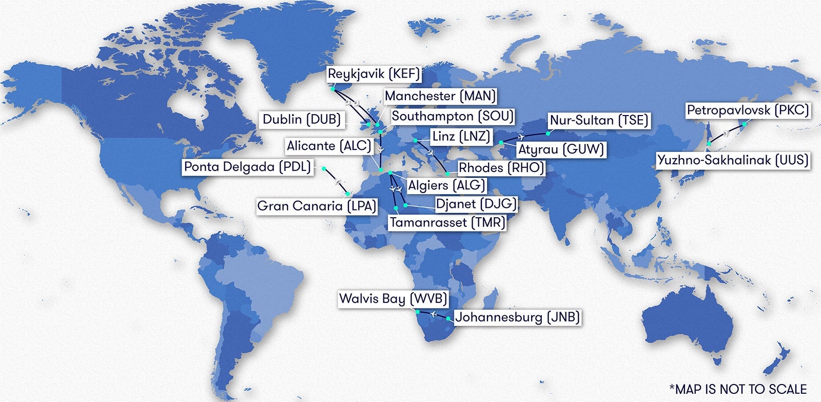- Atyrau, Kazakhstan (GUW) – Nur-Sultan, Kazakhstan (TSE), Qazaq Air, 925 miles