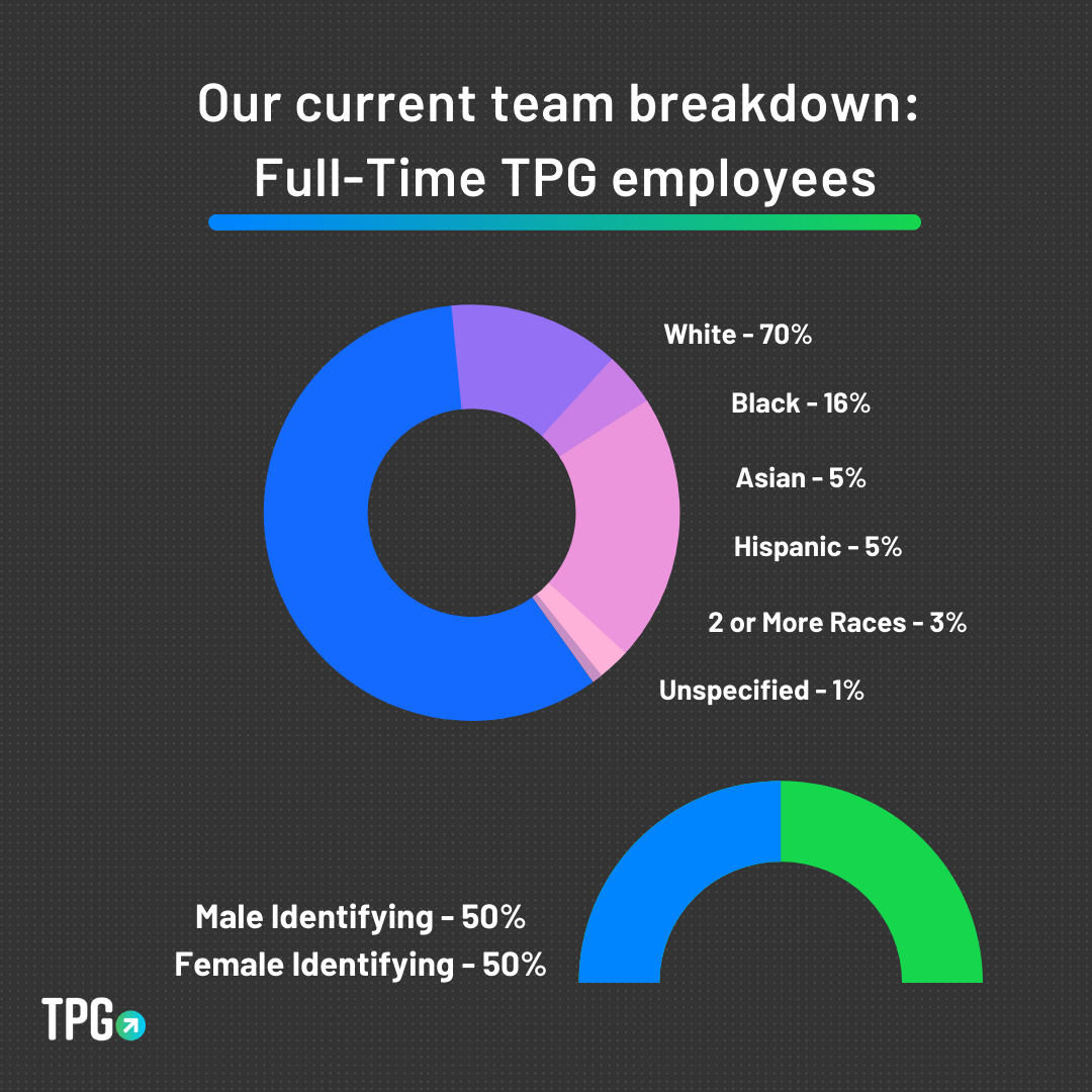 TPG is in full hiring mode, with a range of job openings. TPG's current team breakdown is as follows: 70% White, 16% Black, 5% Asian, 5% Hispanic, 3% two or more and 1% unspecified. And for our parent company, Red Ventures, the numbers are: 66% White, 8% Black, 6.7% Asian, 11% Hispanic, 3% two or more and 3% unspecified.