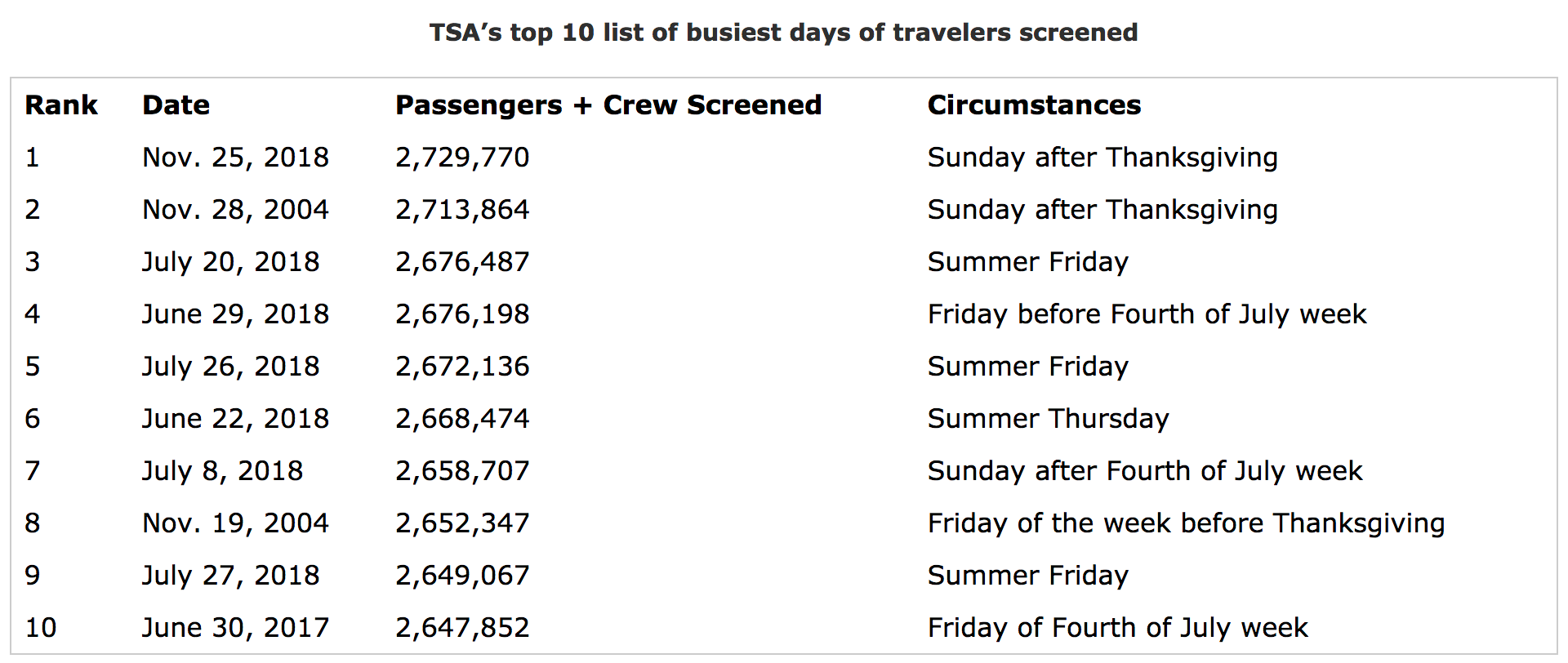 Here is a table of the TSA's top 10 list of busiest days of travelers screened: