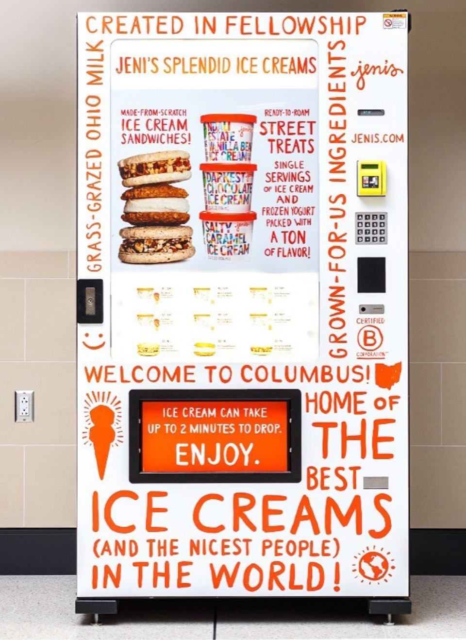 Jeni's Splendid Ice Creams is a local legend when it comes time to get a scoop in Columbus, Ohio. If you didn't get a chance to sample it during your time in Ohio's capital city, don't worry! You can get your fix at two Jeni's vending machines at John Glenn Columbus International Airport (CHM) — one each in Concourses A and B. You have your choice of single-serve, grab-and-go ice cream cups or a rotating selection of our ice cream sandwiches.