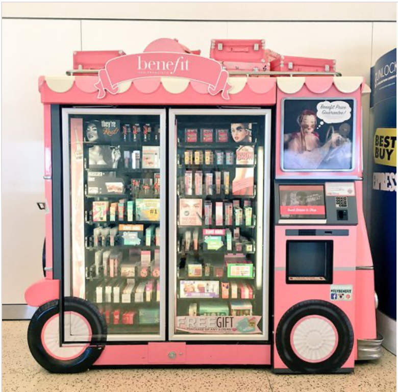 San Franciso-based Benefit Cosmetics has beauty vending machines in more than 30 airports. The vending machine, in the shape of a pink bus, offers its most popular products, including mascara, lipstick, custom powder, face balm, blushes and pore cream.