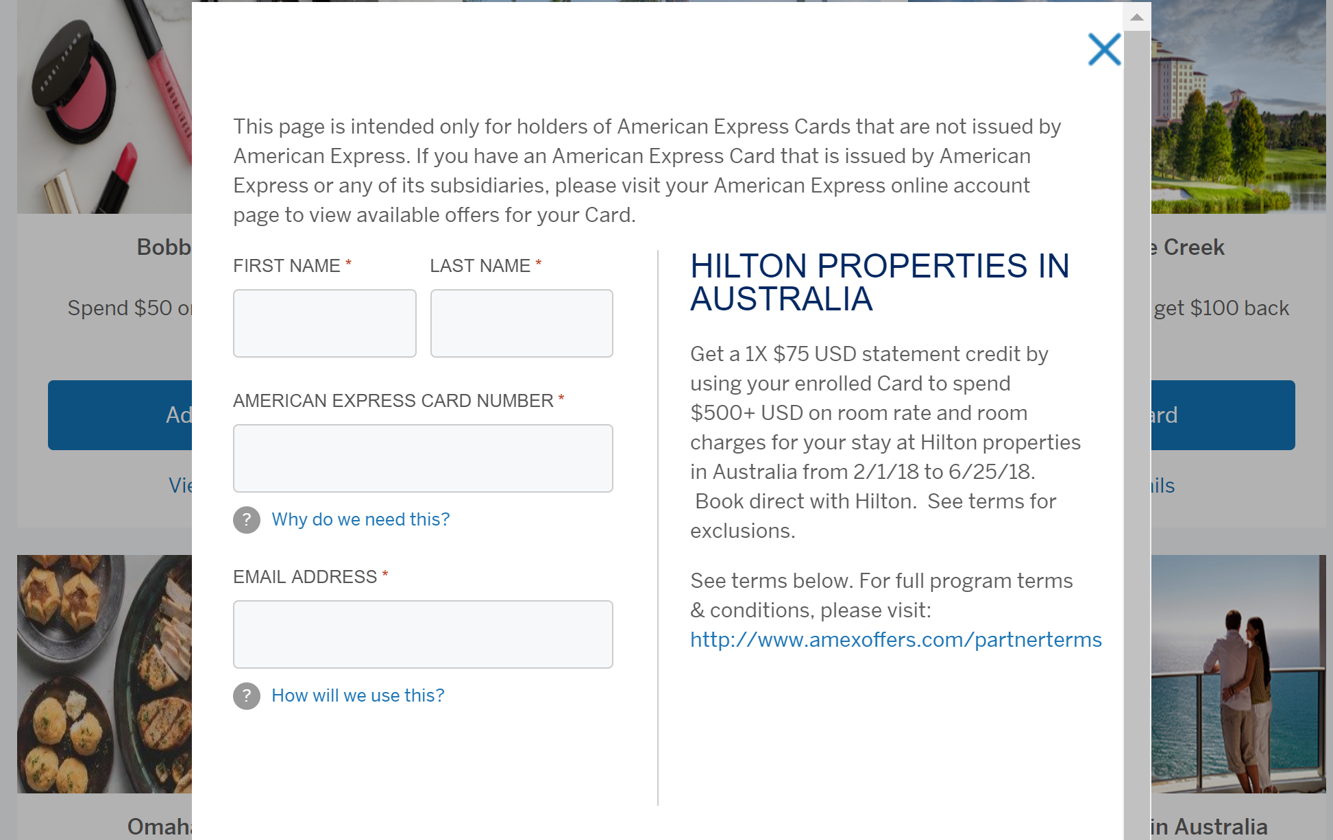 To enroll in one of these offers, just click "Add to Card" and enter your first name, last name, third-party Amex card number and email address.