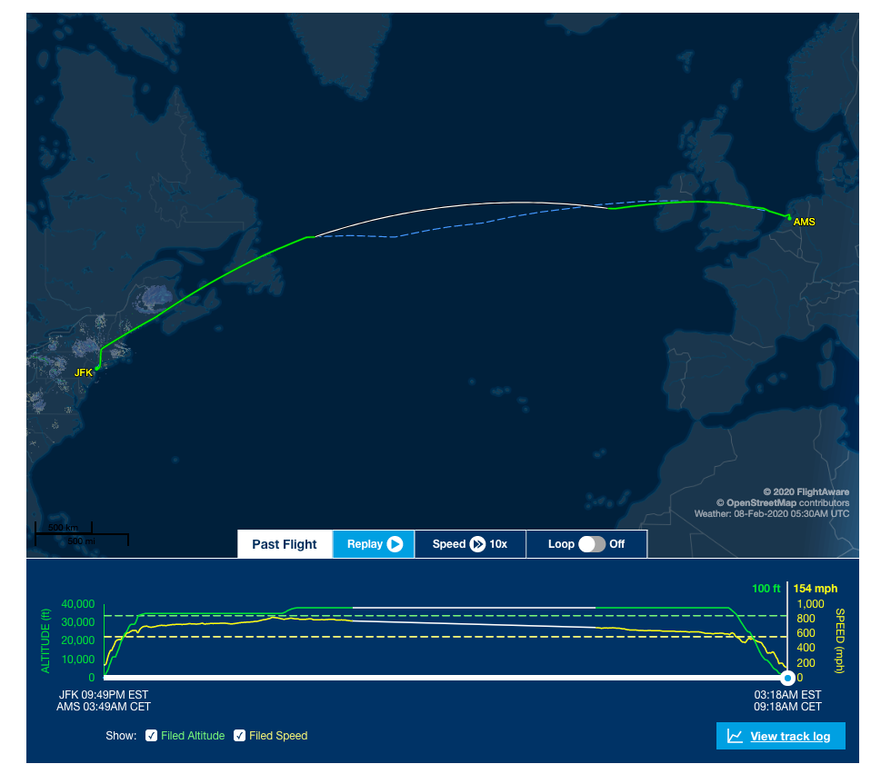 KLM Flight 644 was another example, reaching a speed over the ground of 819 mph between New York JFK and Amsterdam — a record for the carrier, according to KLM spokesman Arturo Diaz. The flight, operated by a Boeing 747-400, completed the normally seven-hour Atlantic crossing in about 5 hours, 20 minutes, according to flight Capt. Peter Bakker.