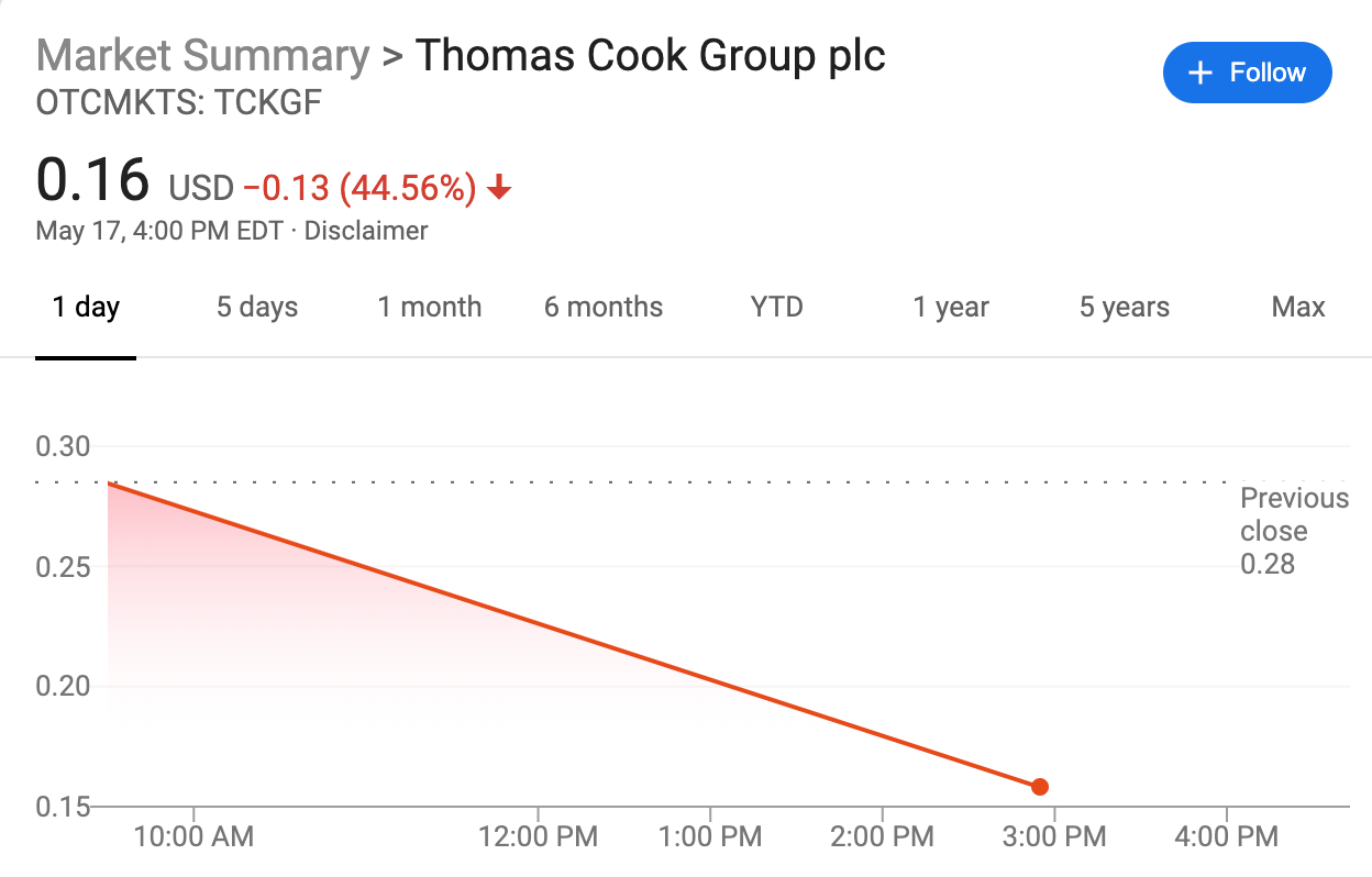 As TPG has reported, many international airlines have succumbed to extreme financial pressures in the not too distant past. Now, European travel conglomerate Thomas Cook appears to be on the verge of collapse after its stock nosedived 44% on Friday to end the week trading at only 16 cents per share.