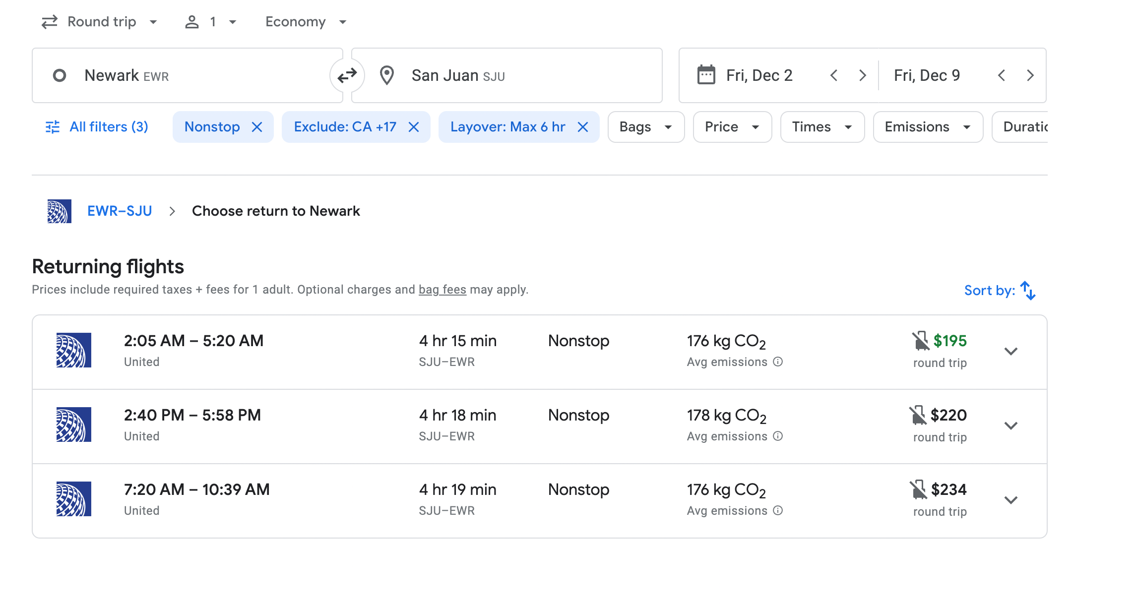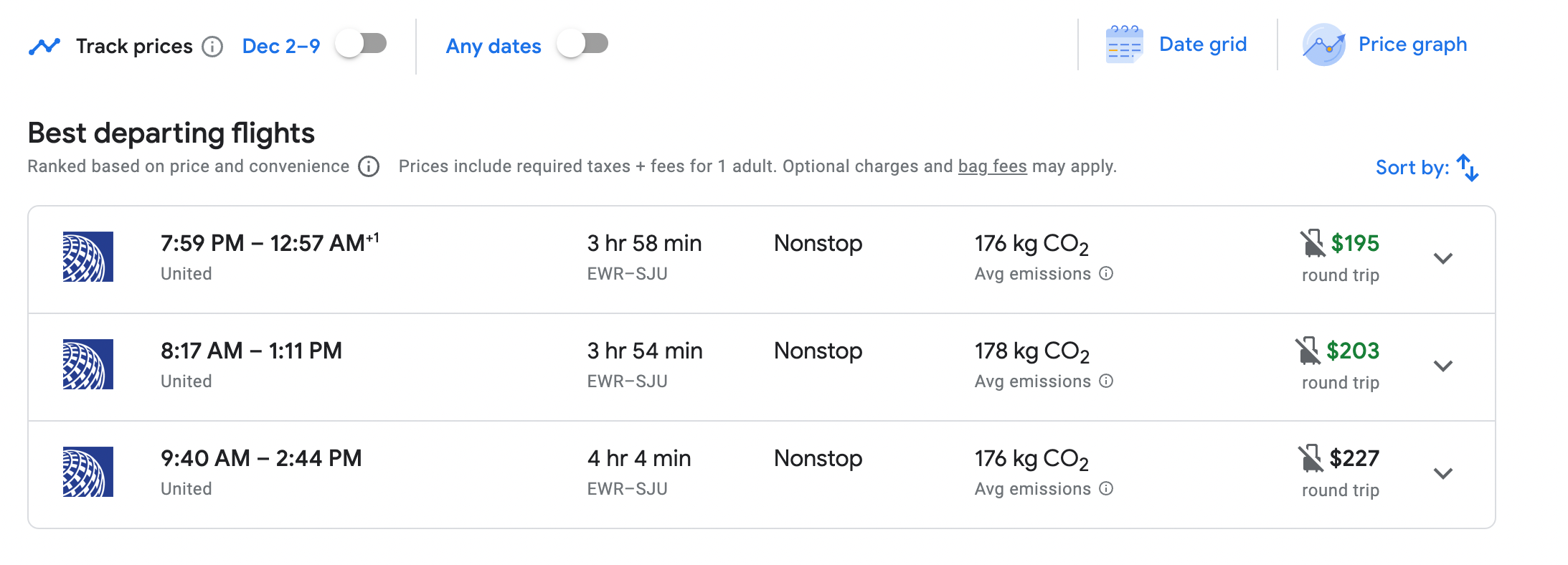 For a Dec. 2 flight to San Juan from Newark, Google Flights displays a nonstop 7:59 p.m. United flight as the cheapest possible option.