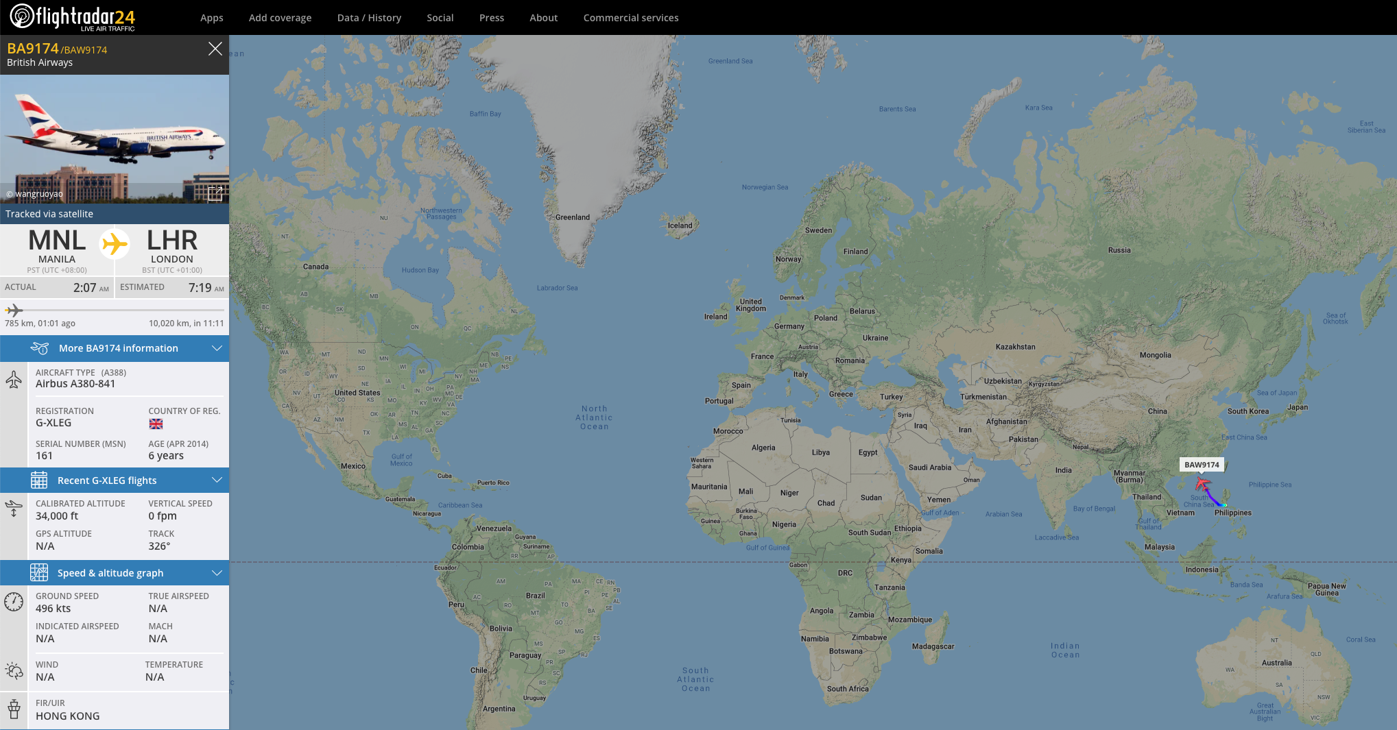 At the time of this writing there was only one A380 airborne in the world, a British Airways jet headed back to London Heathrow from Manila, where it had been since March undergoing scheduled maintenance according to The BA Source. Incidentally, that's the same A380 one of our readers spotted last year at the Oakland airport, an extremely unusual appearance due to a strike by British Airways pilots.
