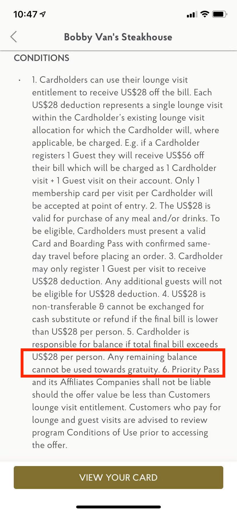 Note that Priority Pass doesn't let you use your dining credit towards gratuity; that will have to come out of your own pocket. Still, leaving a ~$5 tip (or about 18%) on a "free" $28 meal is still a good deal.