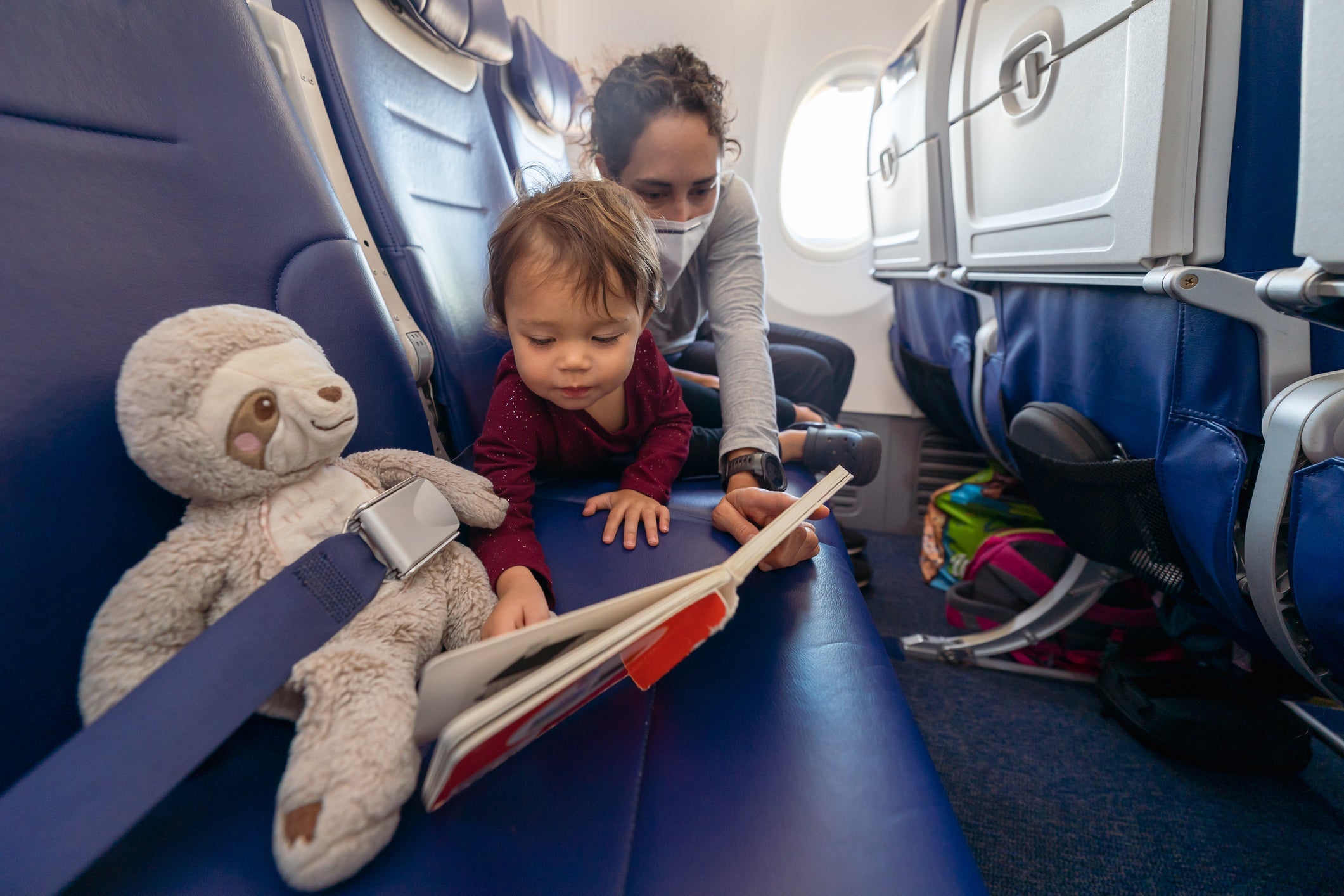 Gently and frequently explain what masks are and try to make it fun for them or a game out of it. Kids love to imitate parents, so try and use that as a convincing argument. If your baby isn't yet 2, it's still a good idea to wear masks around them at home so they get used to seeing you with a mask on and won't constantly pull the mask off your face while sitting in your lap midflight.