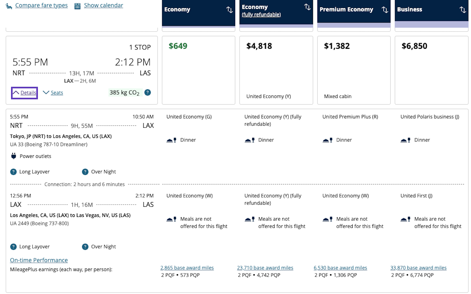You'd pay $649 for a coach ticket or 55,000 Mileage Plus miles on a couple of different itinerary options.