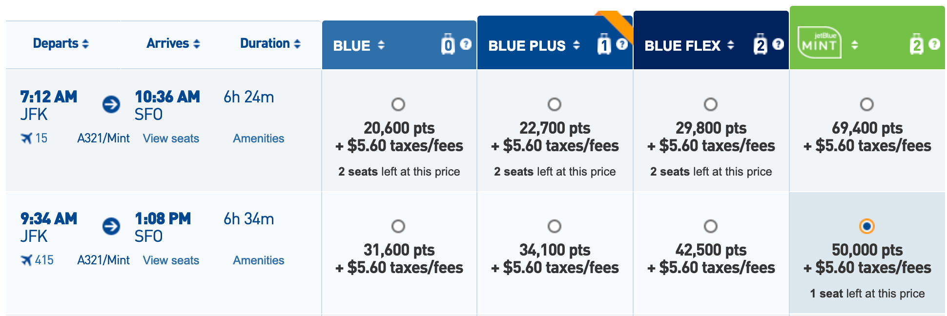 Much like Southwest, JetBlue uses a revenue based program so a seat up front in Mint will cost a different amount of miles on different days. For flights from New York (JFK) to San Francisco (SFO), one of the longest routes to feature Mint, the best you can hope for is about 50,000 miles one way, which roughly maps to a $660 cash ticket.