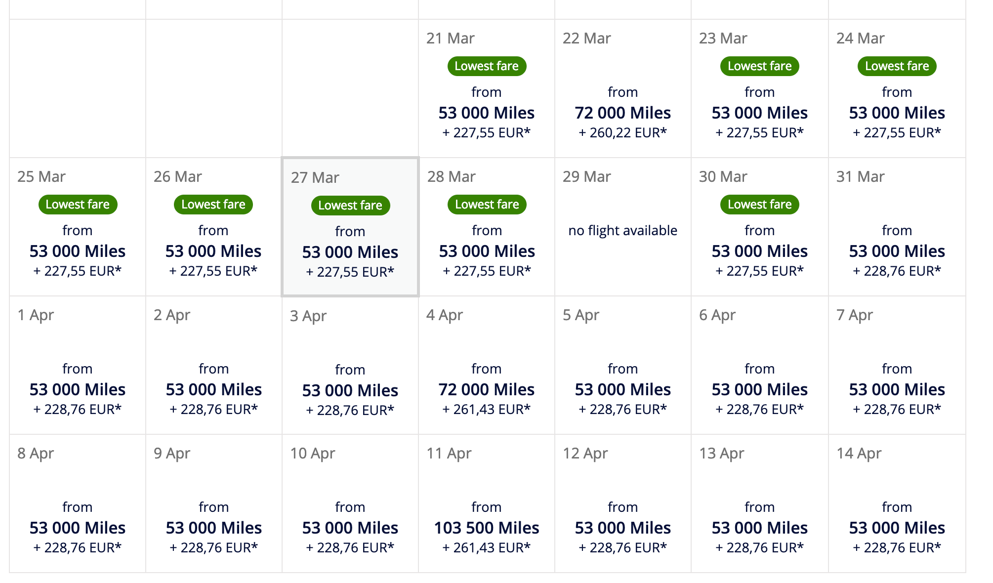 You'll want to try and book towards the beginning of the month to get the best deals, but even this late in March it's possible to find plenty of one-way business class awards between the above cities and Europe for under 60,000 miles each way. For example, you can fly from Toronto to London (LHR) for only 53,000 miles in business class.