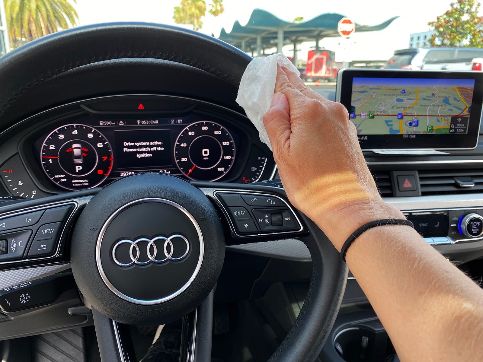 Silvercar has a 19-step cleaning process for all interior areas and surfaces that include using disinfectant and germicidal cleaning solutions on surfaces and vacuuming all footwells and cloth areas. At the Orlando location where I rented, I was told the cars are also allowed to sit for several hours before anyone would enter before and after each rental. I don't know at what temperature viruses die, but I know a parked car in the Orlando heat gets to be approximately a million degrees in a hurry.