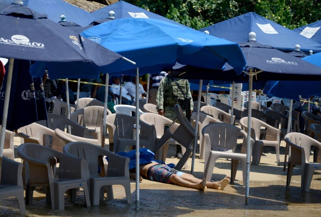 Video from local Mexican news outlet, El Sol de Acapulco, shows a bizarre scene unfolding minutes after the murders: Tourists and beachgoers relaxing and dining under beach umbrellas as the two bodies sit mere feet away. The crime scene is closed off from the beach by police tape.