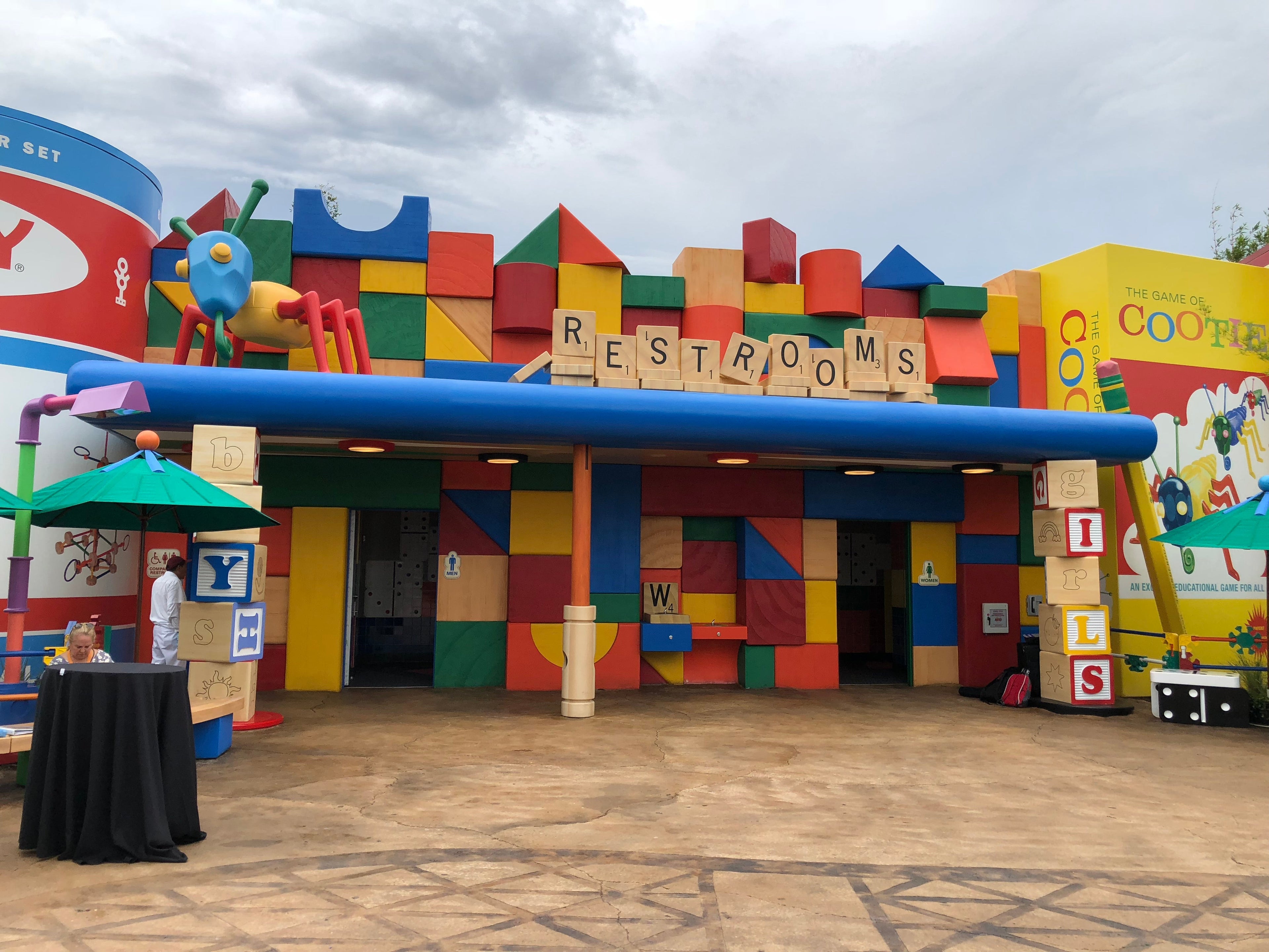 What's especially cool about Toy Story Land is the way Disney carries out the theme — the attention to the tiniest of details (a four-point Scrabble "W" indicates the water fountain) and the vibrant primary color scheme, for example. There's also the unexpected, seemingly organic placement of characters and toys throughout the "backyard." You'll spot the occasional No. 2 pencil, and a misplaced Sorry game piece. Even the souvenir stand is made to look like a Fisher-Price Play Family Camper.