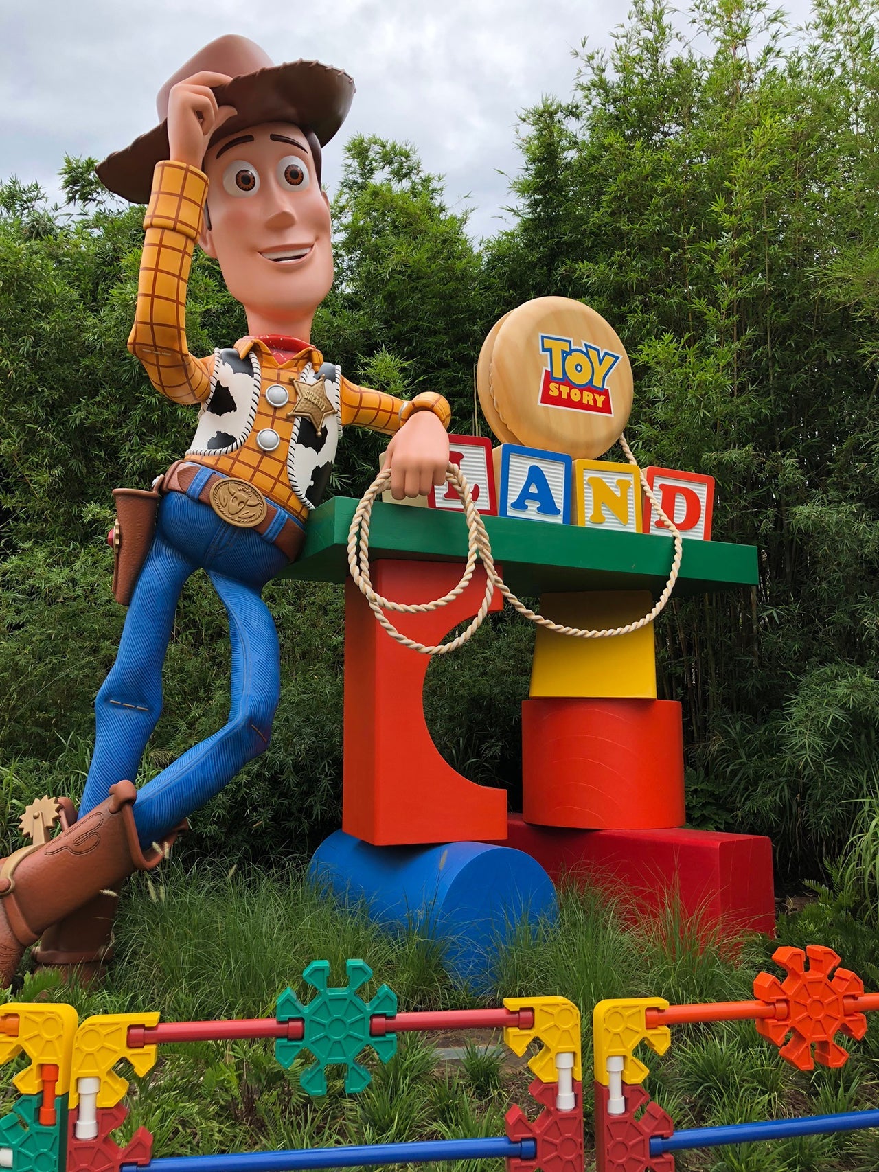 A larger-than-life Woody greets guests and stands watch over the park which, like a true childhood backyard, is cluttered with Tinkertoys, Dominoes, Scrabble tiles and wooden blocks.