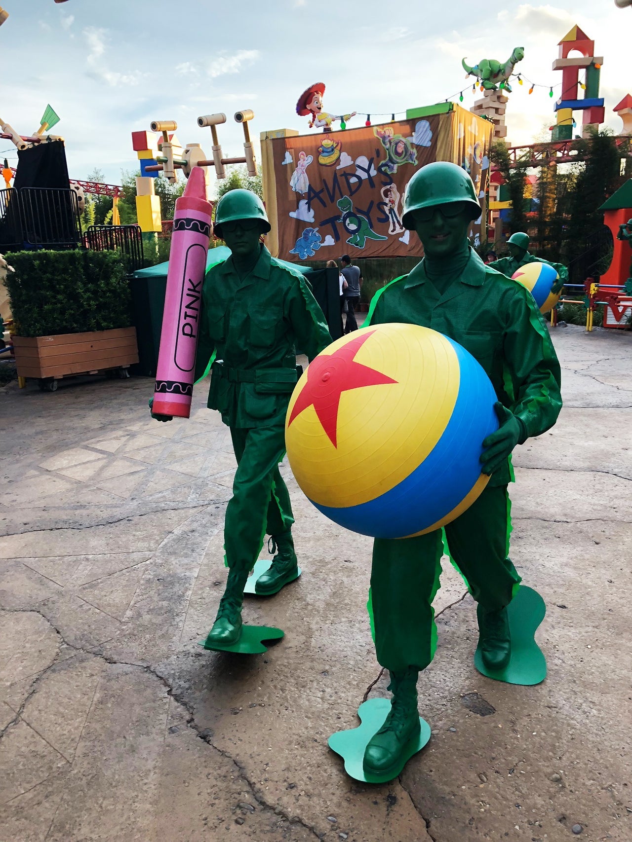 The army men, a mix of statues and performers, really put things in perspective. After all, the figurines you played with as a child stand just over two inches tall. In Toy Story Land, they're the height of grown men — or taller.