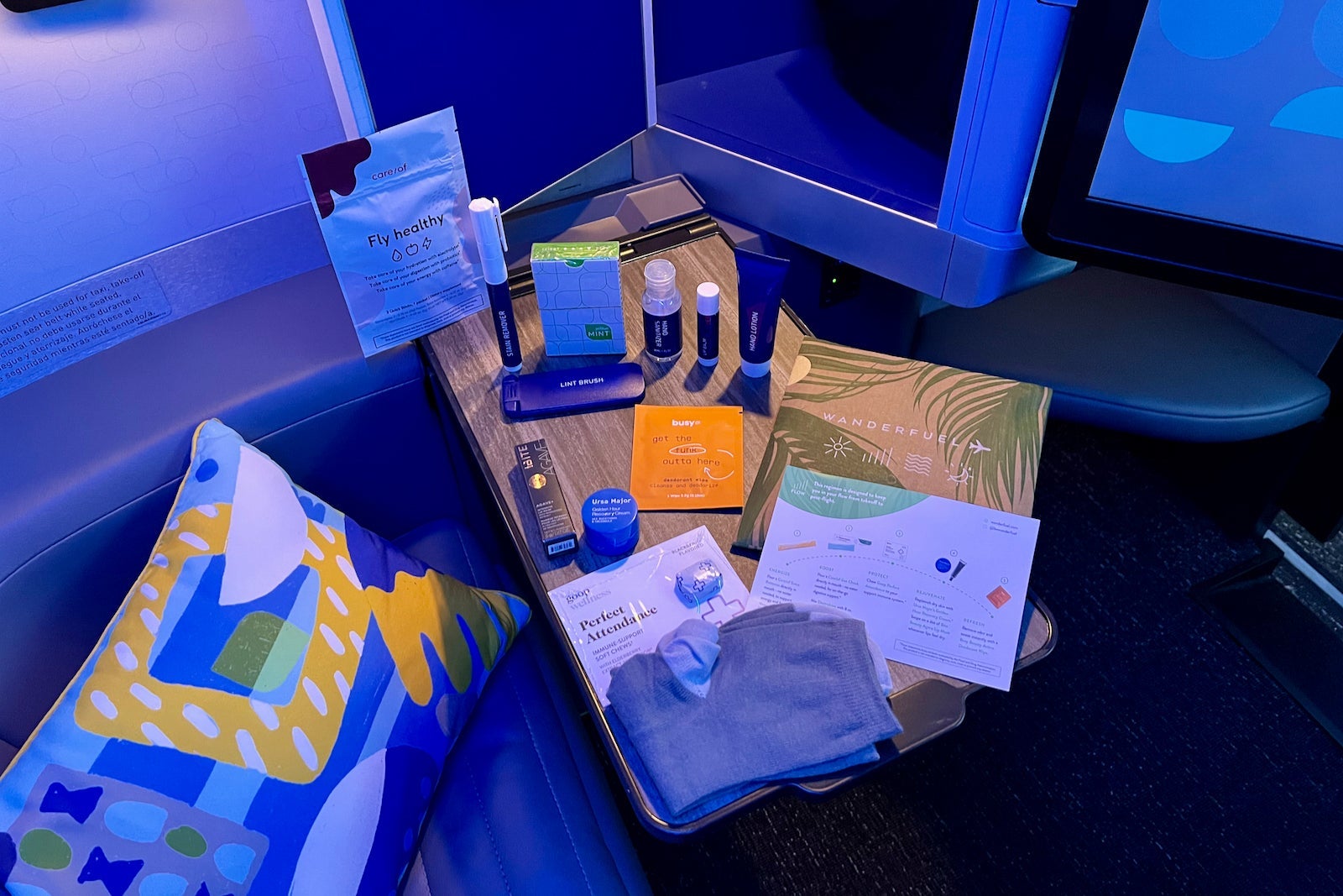 Once in flight, you'll receive some additional amenities as a Studio passenger, including pajamas, slippers and an essentials kit with playing cards, a lint roller, chapstick and more.