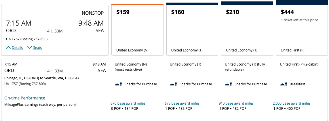 Depending on the airline, fare and your elite status, this could certainly move the needle in favor of the Chase portal. Below is a screenshot of a random one-way flight on United Airlines between Chicago and Seattle where the number of United miles (a Chase transfer partner) and Chase points redeemed through the Ultimate Rewards portal are roughly equivalent. While you wouldn't earn any elite-qualifying activity or award miles by transferring Chase points to United and then redeeming for an award ticket, if you redeemed Chase points through the Ultimate Rewards portal instead, you would earn between 670 and 2,000 miles for the flight along with Premier-qualifying credits, depending on the fare you purchased.