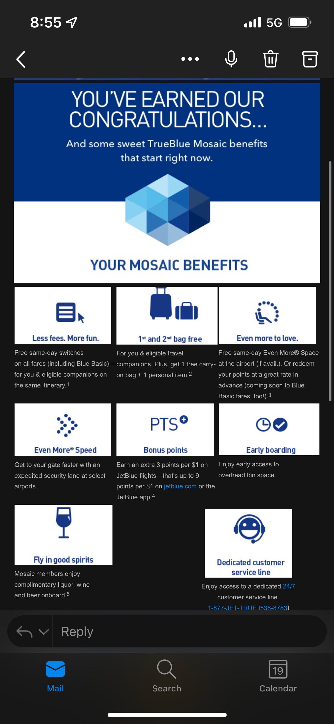 JetBlue was offering JetBlue Plus cardholders the chance to earn Mosaic Qualifying points by spending $5,000, $10,000 or $15,000 on the card in the last three months of 2021. So, I started paying for the bulk of my purchases with my JetBlue Plus card, eventually accruing $10,000 in spend and just enough points to qualify for Mosaic status on Jan. 19. I'm most looking forward to the free same-day Even More Space seat upgrades and dedicated customer service line.