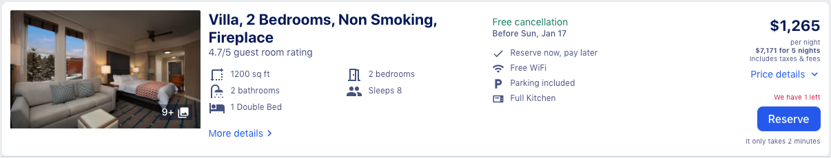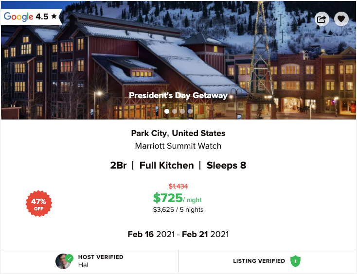 As an example, he showed the Marriott Summit Watch in Park City, UT. For a five-night stay in mid-February, you could book a two-bedroom villa with a full kitchen that sleeps up to 8 guests for $725/night — or a total of $3,806.