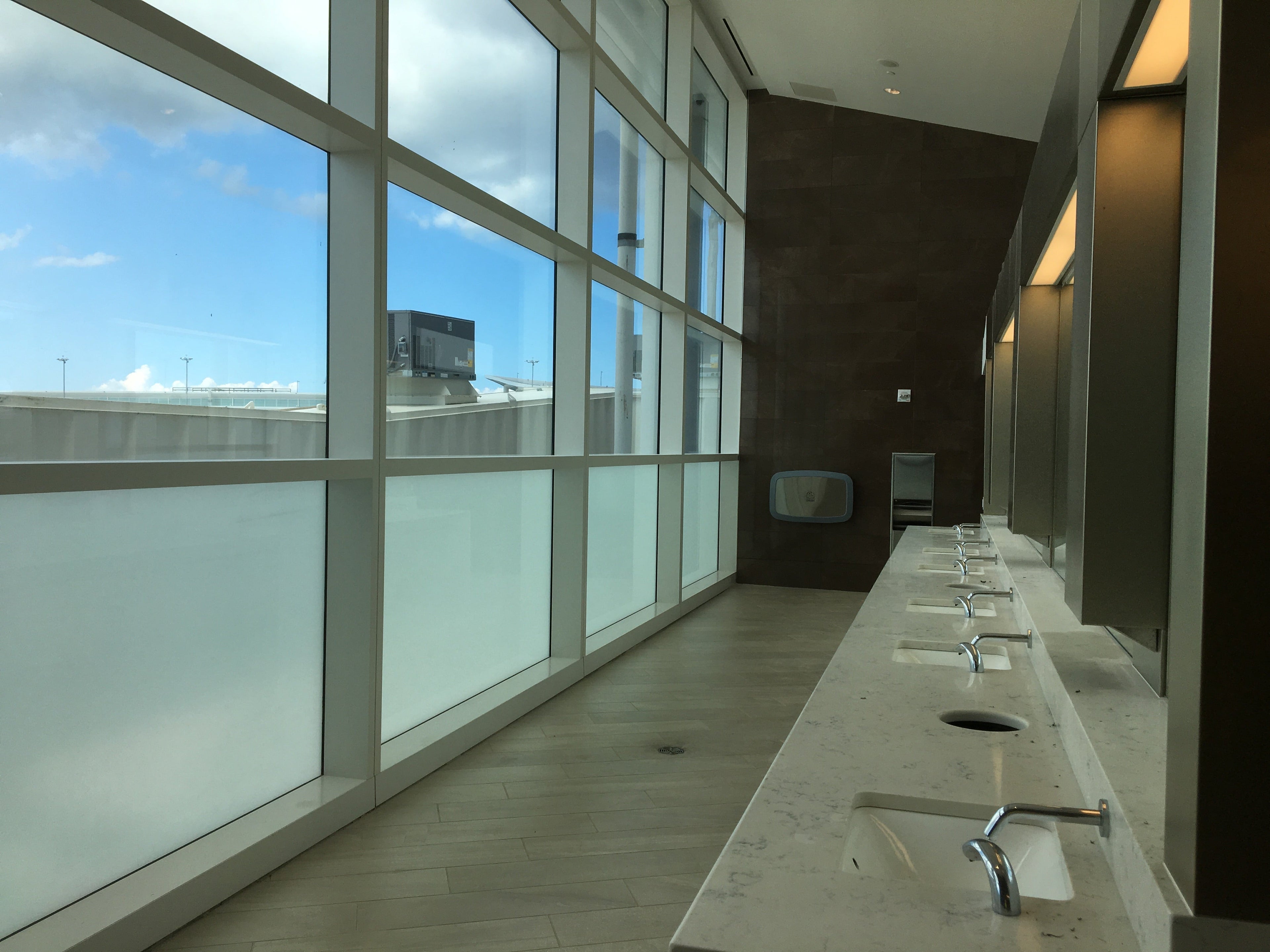 The restrooms are spacious and airy, with stalls large enough to hold rolling carry-on bags, along with shelves and hooks to hold purses and jackets. There's a large family restroom, complete with a changing table, along with a separate room for nursing mothers that includes a reclining chair, a changing table and a sink.